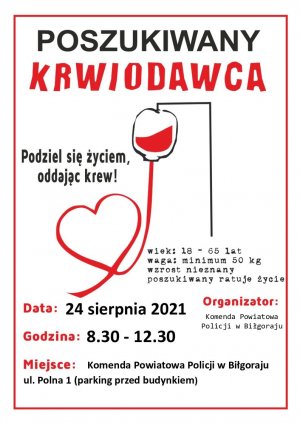 Okazja będzie w najbliższy wtorek, 24 sierpnia na parkingu przed budynkiem komendy przy ulicy Polna 1 (w godz. 8.30-12.30). Zbiórka krwi jest organizowana właśnie przez miejscową policję.