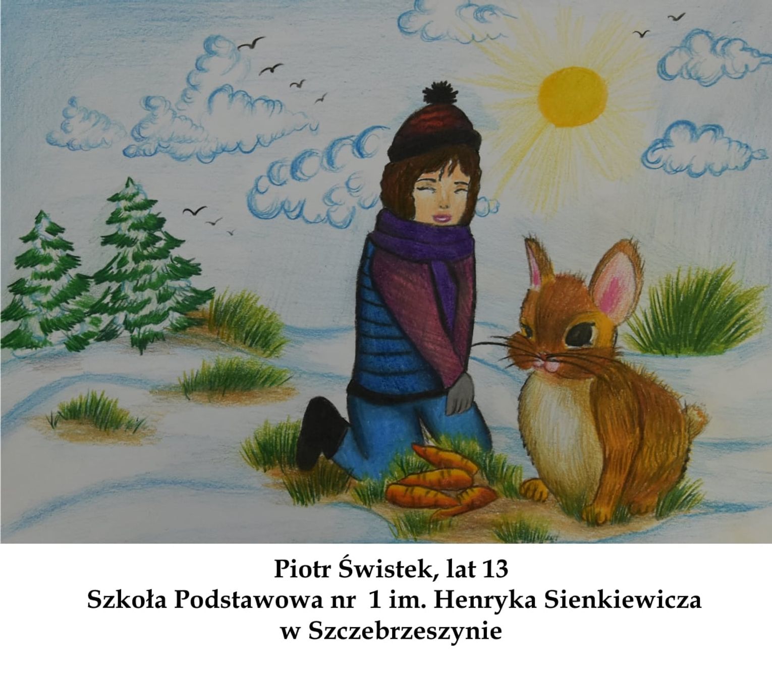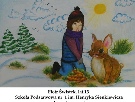 Uczniowie klas 7-8 też pięknie rysowali. A nagrodzeni zostali: Piotr Świstek (lat 13, Szkoła Podstawowa nr 1 im. Henryka Sienkiewicza w Szczebrzeszynie), Zuzanna Grzesiak (lat 12, Szkoła Podstawowa im. Jana Pawła II w Moniatyczach), Sandra Kowalczyk (kl. 8, Szkoła Podstawowa Nr 8 w Zamościu). Wyróżnieni zostali: Martyna Janicka (lat 13, Szkoła Podstawowa w Typinie), Julia Babij (lat 13, Szkoła Podstawowa w Luchowie Dolnym).