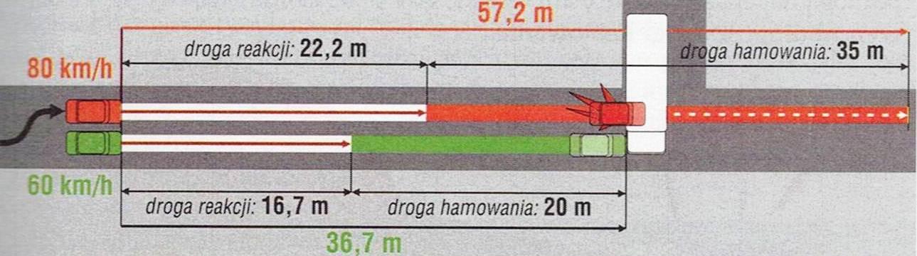 Zielony samochód jadący z prędkością 60km/h zatrzymał się przed przeszkodą, czerwony jadący „tylko” 20km/h szybciej uderzył pojawiająca się przeszkodę z prędkością 60km/h, gdyż do pełnego zatrzymania z tej prędkości potrzebowałby około 57m i to w dobrych warunkach drogowych i przy tym samym czasie reakcji i takich samych układach hamulcowych.