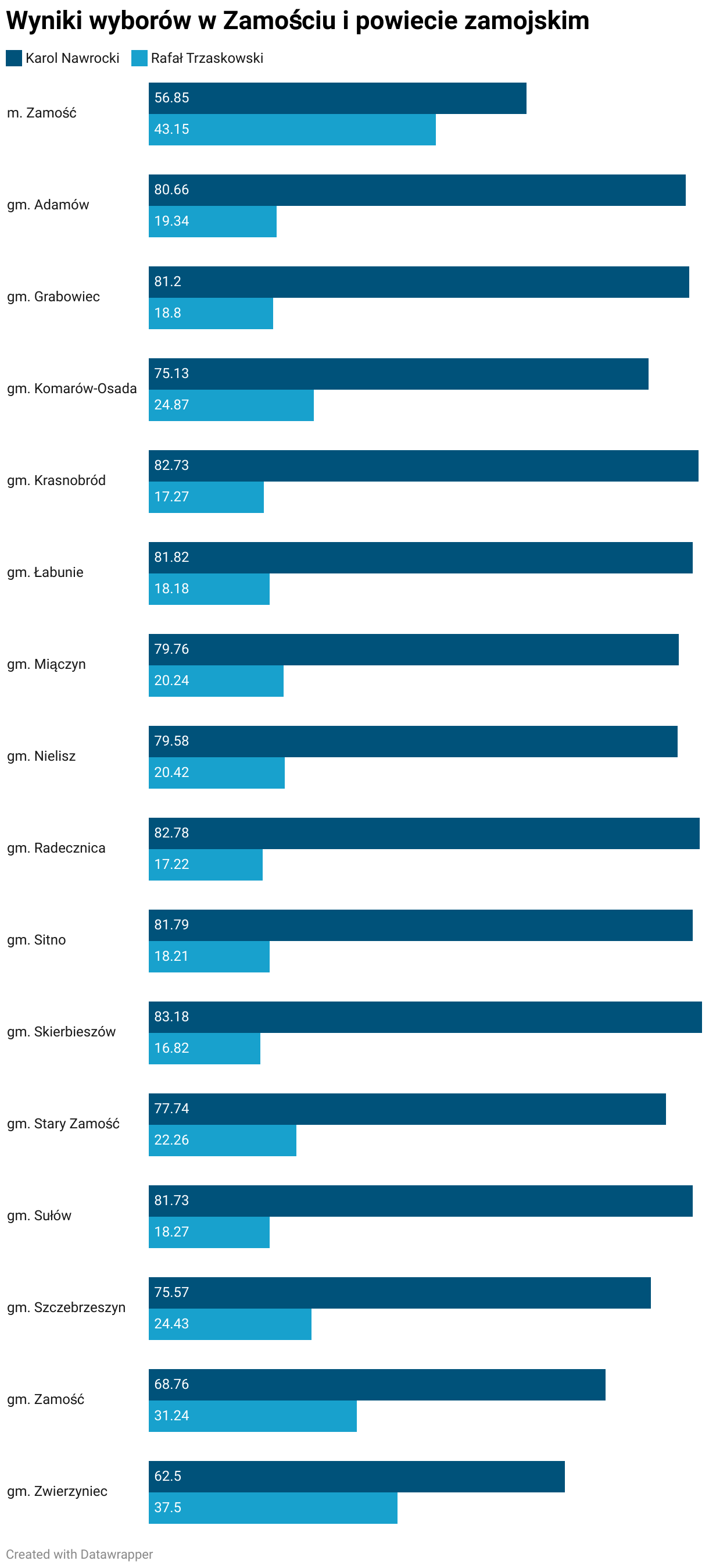 Poniżej w tabeli znajdują się wyniki głosowania w drugiej turze wyborów dla Zamościa i gmin powiatu zamojskiego.