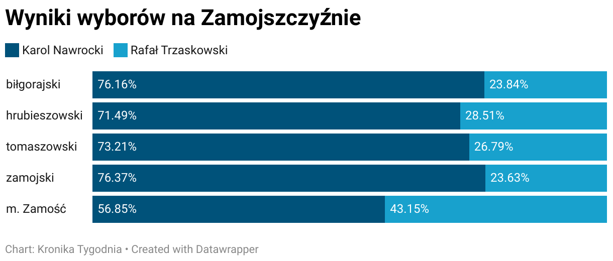 Największe poparcie Karol Nawrocki miał w województwie podkarpackim, gdzie zdobył aż 780 429 głosów (71,02%), ale też na Podkarpaciu kolejne 318 485 głosujących postawiło krzyżyk przy nazwisku Trzaskowskiego. Drugi najlepszy wynik wyborczy Nawrocki osiągnął w województwie lubelskim. Zagłosowało na niego 720 119 wyborców (66,54%). Na Rafała Trzaskowskiego 362 053 wyborców.