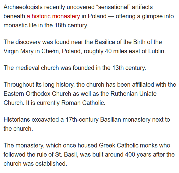 „Archeolodzy niedawno odkryli ‘sensacyjne’ artefakty pod historycznym klasztorem w Polsce – rzucające światło na życie monastyczne w XVIII wieku” – pisze nowojorska gazeta. To rzadki przypadek, kiedy lokalne znalezisko z Lubelszczyzny przyciąga uwagę międzynarodowych mediów o tak dużym zasięgu.