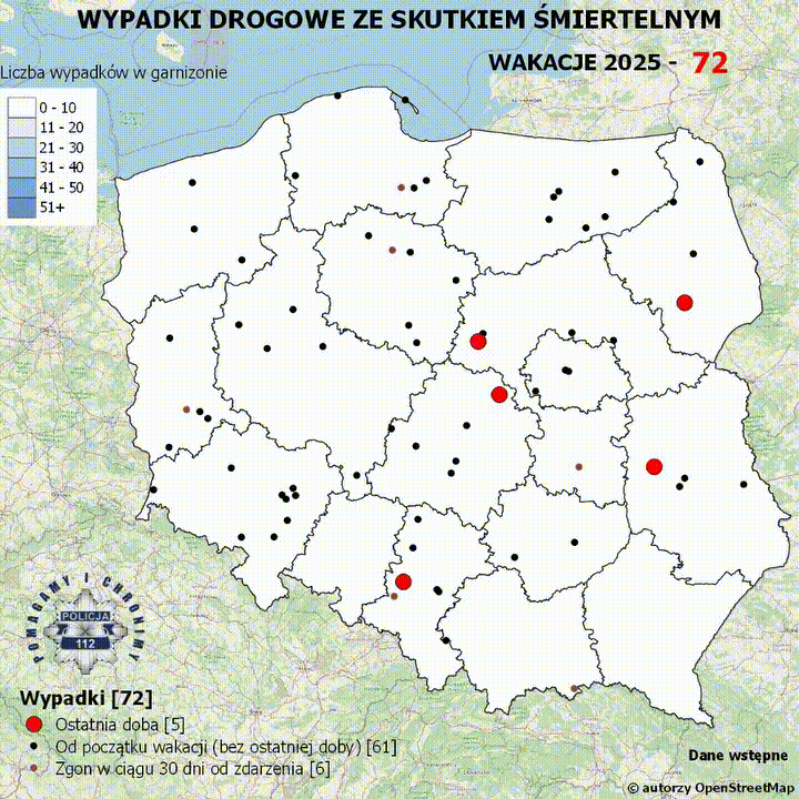 - czarne punkty – oznaczające wypadki śmiertelne od początku wakacji,