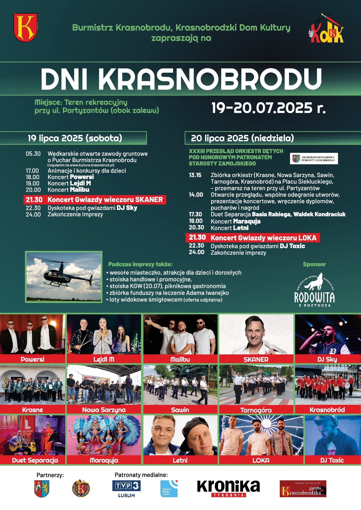 Miejscem Dni Krasnobrodu będzie teren rekreacyjny przy ul. Partyzantów (obok zalewu). Impreza rusza w sobotę (19 lipca) z samego rana od zawodów wędkarskich o Puchar Burmistrza Krasnobrodu. O godz. 17 zaplanowano animacje i konkursy dla dzieci, a o godz. 18 na scenie powinien pojawić się zamojski zespół Powersi, a po nim Lejdi M oraz Malibu. O godz. 21.30 zaplanowano występ gwiazdy wieczoru, którą będzie zespół Skaner – grupa muzyczna nurtu disco polo, znana z takich przebojów jak „Nadzieja”, „American Boy” i „Moja wolność”. Zwieńczeniem pierwszego dnia wydarzenia będzie dyskoteka pod gwiazdami.