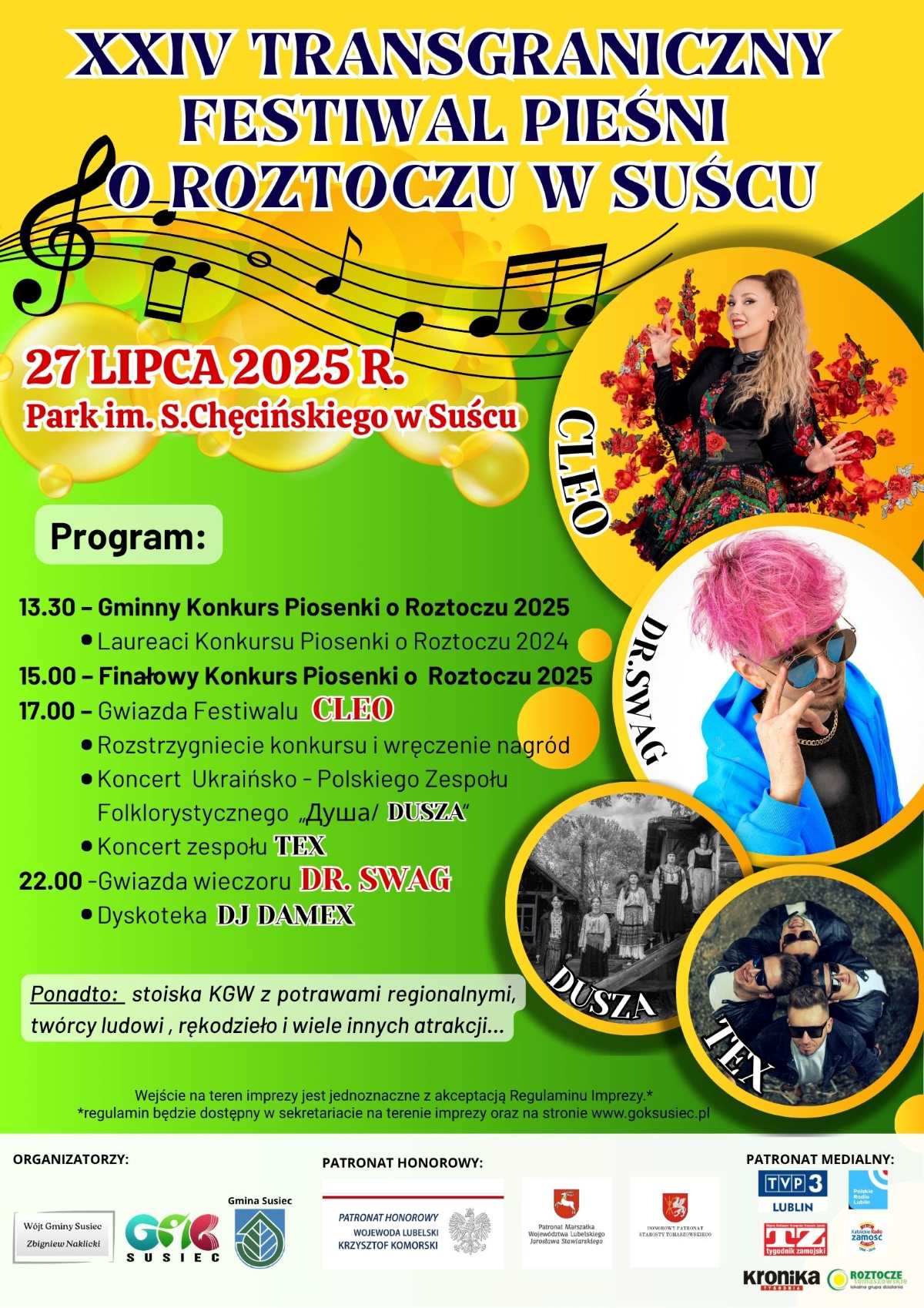 Festiwal rozpocznie się o godz. 13.30 w Parku im. Stanisława Chęcińskiego w Suścu od Gminnego Konkursu Piosenki o Roztoczu 2025. Na godzinę 15 zaplanowano koncert finałowy.