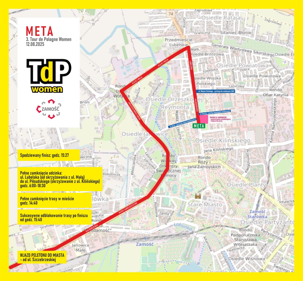 Meta wyścigu znajdzie się przy ul. Piłsudskiego (skrzyżowanie z ul. Okrzei) – zawodniczki mają tam finiszować około godz. 15:27. W rejonie mety i na ulicach prowadzących do niej (m.in. Lubelska, Wojska Polskiego, Okrzei, Koszary) utrudnienia potrwają od 6:00 do 18:30, a w godz. 14:40–15:40 trasa będzie całkowicie zamknięta.