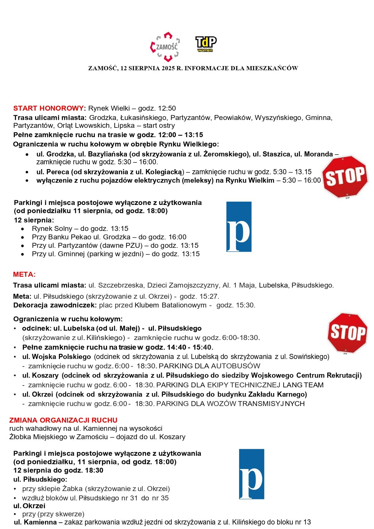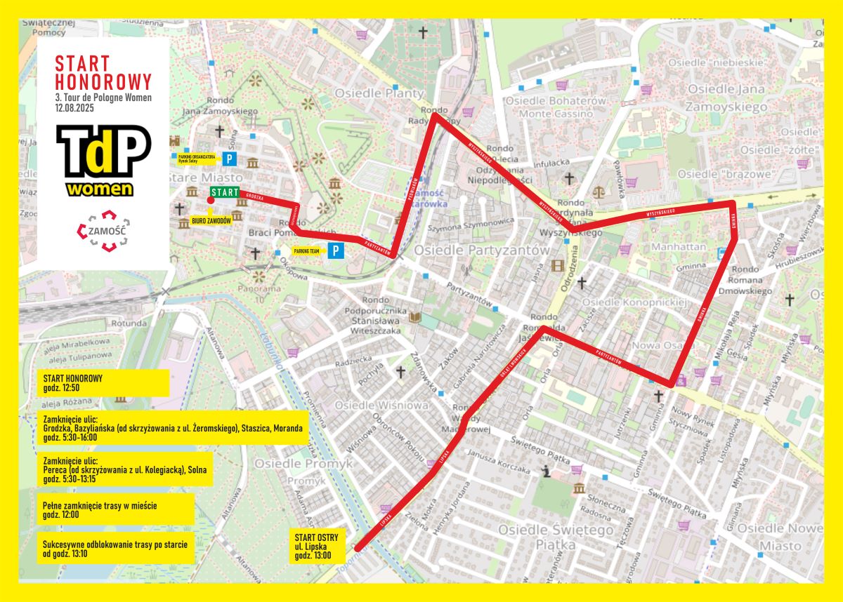 Start honorowy zaplanowano na godz. 12:50 z Rynku Wielkiego, skąd peleton przejedzie m.in. ulicami Grodzką, Partyzantów, Wyszyńskiego i Lipską. W godzinach 12:00–13:15 na tej trasie ruch zostanie całkowicie wstrzymany. W centrum utrudnienia rozpoczną się jednak znacznie wcześniej – od 5:30 zamknięte będą m.in. Grodzka, Bazyliańska, Staszica i Moranda, a także wyłączony z ruchu meleksów Rynek Wielki.