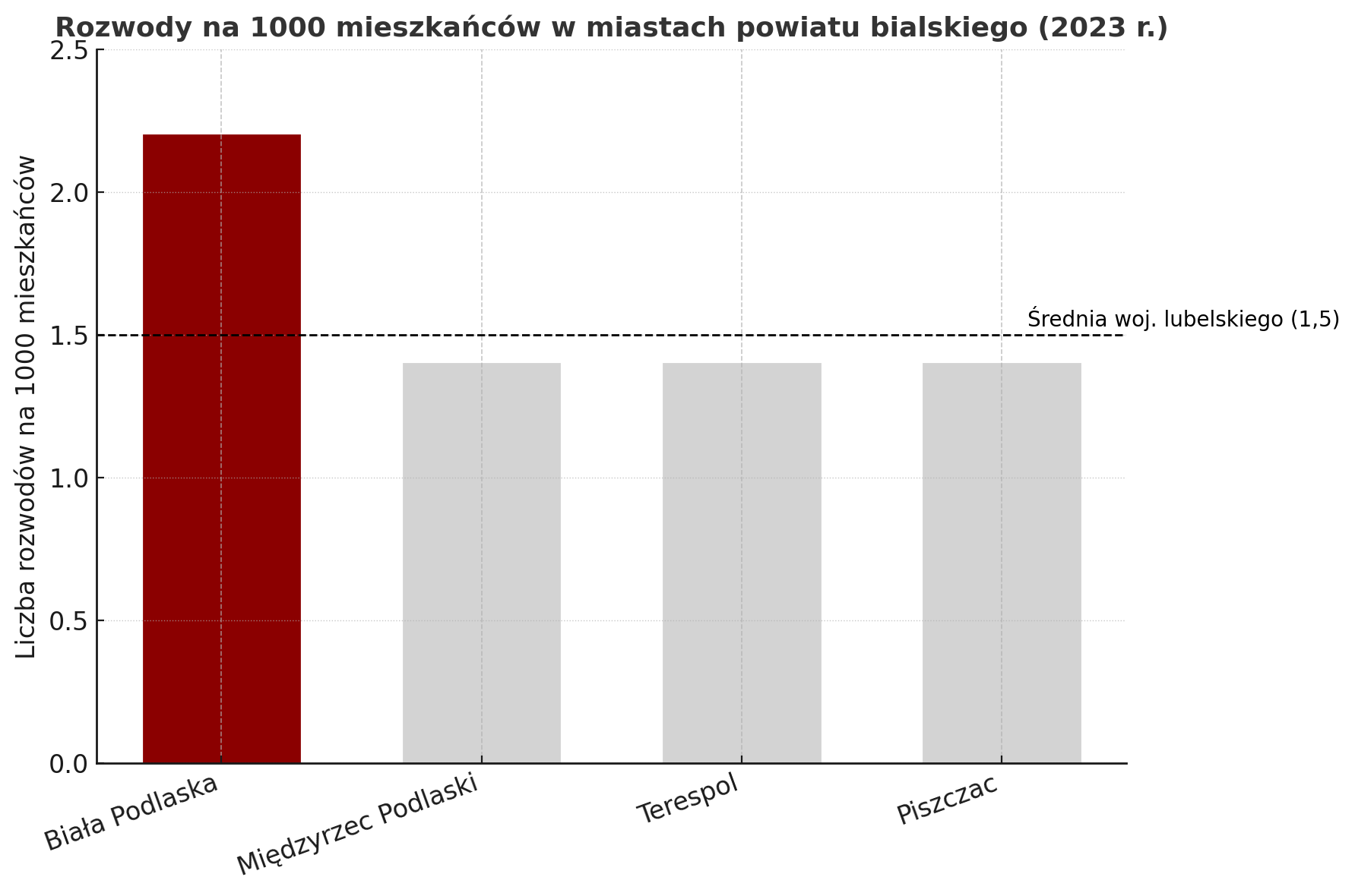 Biała Podlaska wyprzedziła wszystkie pozostałe miasta województwa lubelskiego, osiągając wynik znacznie powyżej średniej krajowej i regionalnej. Wysoka pozycja może mieć związek z faktem, że jest to jedno z największych miast wschodniej Polski, z rozwiniętym rynkiem pracy i dużym udziałem młodych dorosłych w strukturze demograficznej. To grupa, w której częstotliwość zawierania i rozwiązywania małżeństw jest statystycznie wyższa.