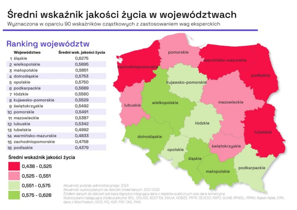 „W obu wagowaniach południowo-centralny pas kraju (śląskie, małopolskie, dolnośląskie, wielkopolskie/opolskie) tworzy grupę liderów, a północny wschód i część północnego zachodu (podlaskie, warmińsko-mazurskie, zachodniopomorskie) – najsłabszą.