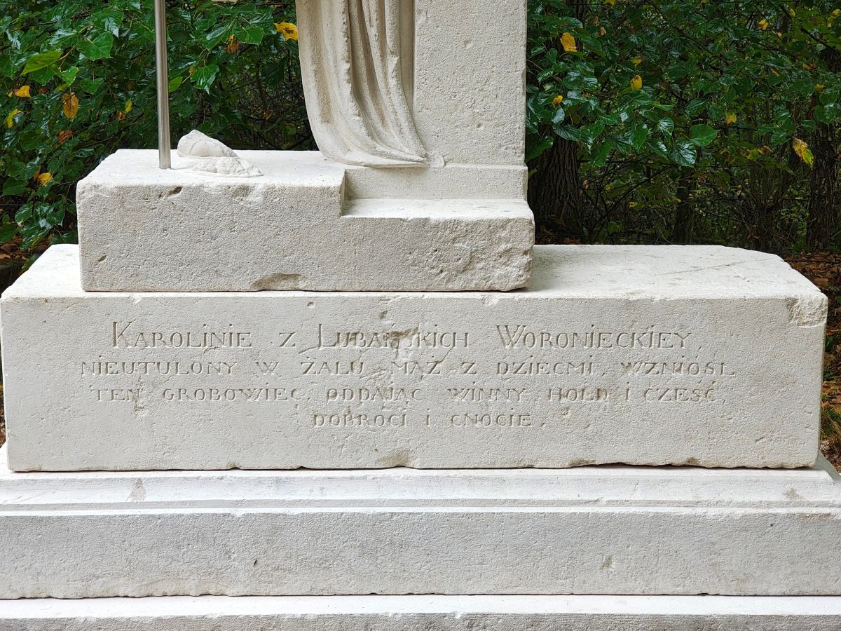 „Karolinie z Lubańskich Woronieckiey nieutulony w żalu mąż z dziećmi wzniósł ten grobowiec oddając winny hołd i cześć dobroci i cnocie”.
