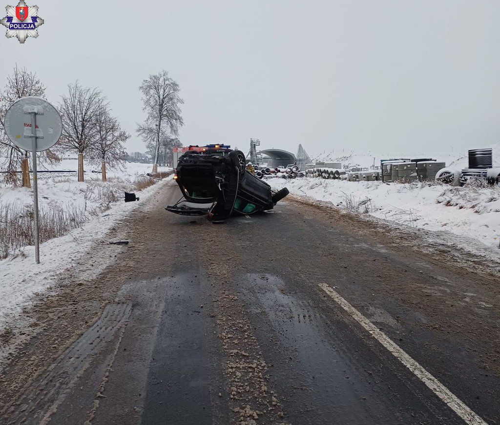 Około godziny 6:30 w Nowy Rok dyżurny zamojskiej Policji otrzymał zgłoszenie, że w Jarosławcu, na drodze krajowej numer 74, dachowało auto. Natychmiast skierował tam policyjne patrole, załogę karetki pogotowia oraz strażaków.