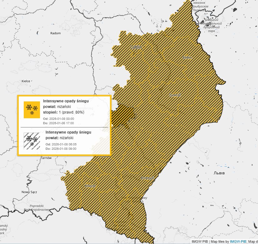 Jak informuje IMGW, przez region przemieszcza się strefa opadów śniegu. Natężenie opadów wynosi obecnie do 1 cm na godzinę, jednak lokalnie w kolejnych godzinach może wzrosnąć nawet do około 2 cm na godzinę. Opady śniegu mają utrzymywać się do godzin wieczornych, co może powodować pogorszenie warunków drogowych.