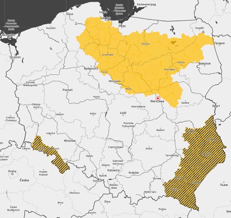 Równocześnie IMGW ostrzega przed silnym mrozem. Miejscami temperatura powietrza spadła do około -20°C, a lokalnie nawet do -24°C. W najbliższym czasie możliwe jest jeszcze niewielkie dalsze obniżenie temperatury, natomiast po wschodzie słońca prognozowany jest jej stopniowy wzrost. Ostrzeżenie obowiązuje od godziny 6:23 do 8:00.