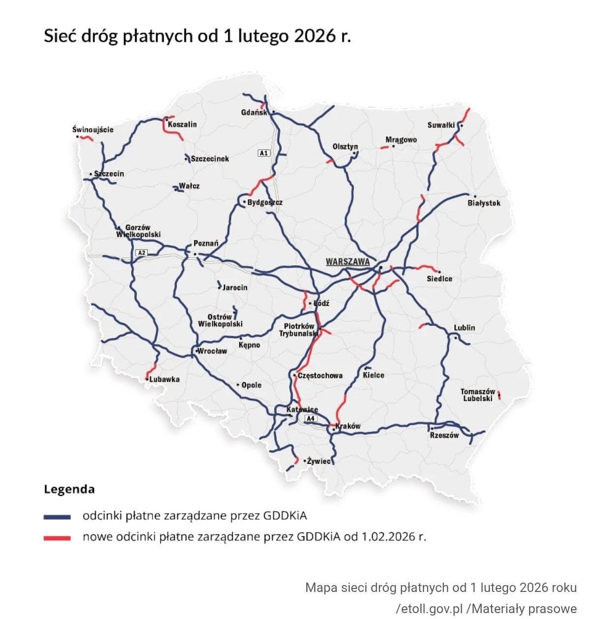 Poniżej mapa przedstawiająca sieć dróg płatnych od 1 lutego 2026 r.