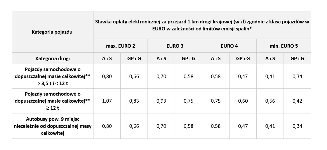 Wysokość stawek opłaty elektronicznej za przejazd 1 km dla dróg krajowych przedstawia poniższa tabela.