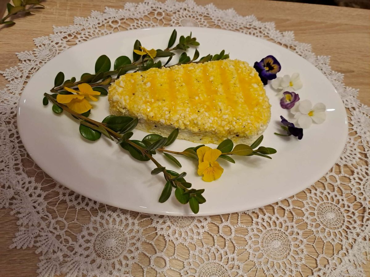 Wszystko razem dokładnie mieszamy, formujemy i umieszczamy w lnianej ściereczce. Pozostawiamy pod obciążeniem na noc, aby odsączyć wodę (serwatkę). Rano serek wkładamy do uchylonego piekarnika nagrzanego do 10 stopni Celsjusza na około 1,5–2 godziny, aby go wysuszyć. Następnie smarujemy serek żółtkiem i jest gotowy.