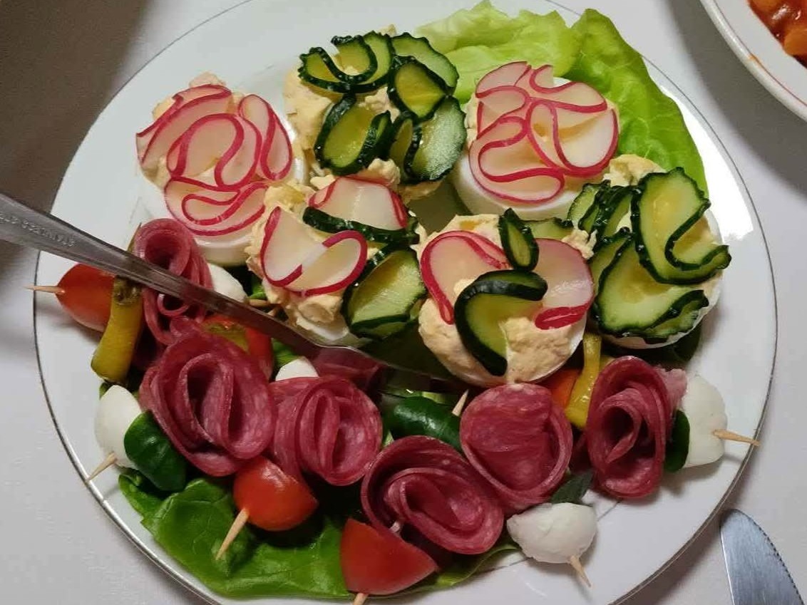 Jajka gotujemy na twardo, przekrajamy w poprzek i wyjmujemy żółtka. Aby jajko się nie przewracało, przycinamy jego czubek. Na początku ogórki i rzodkiewki kroimy w bardzo cienkie plasterki i solimy, aby zmiękły. Żółtka dokładnie przecieramy przez sitko lub rozgniatamy widelcem. Dodajemy do żółtek szynkę, majonez oraz natkę pietruszki lub szczypiorek według własnego uznania, a następnie doprawiamy solą i pieprzem do smaku. Wypełniamy wydrążone białka jajek. Na wierzchu robimy kleks z majonezu. Plasterki ogórka i rzodkiewki składamy na pół, tworzymy falę i układamy na majonezie.
