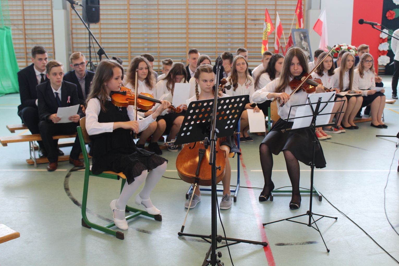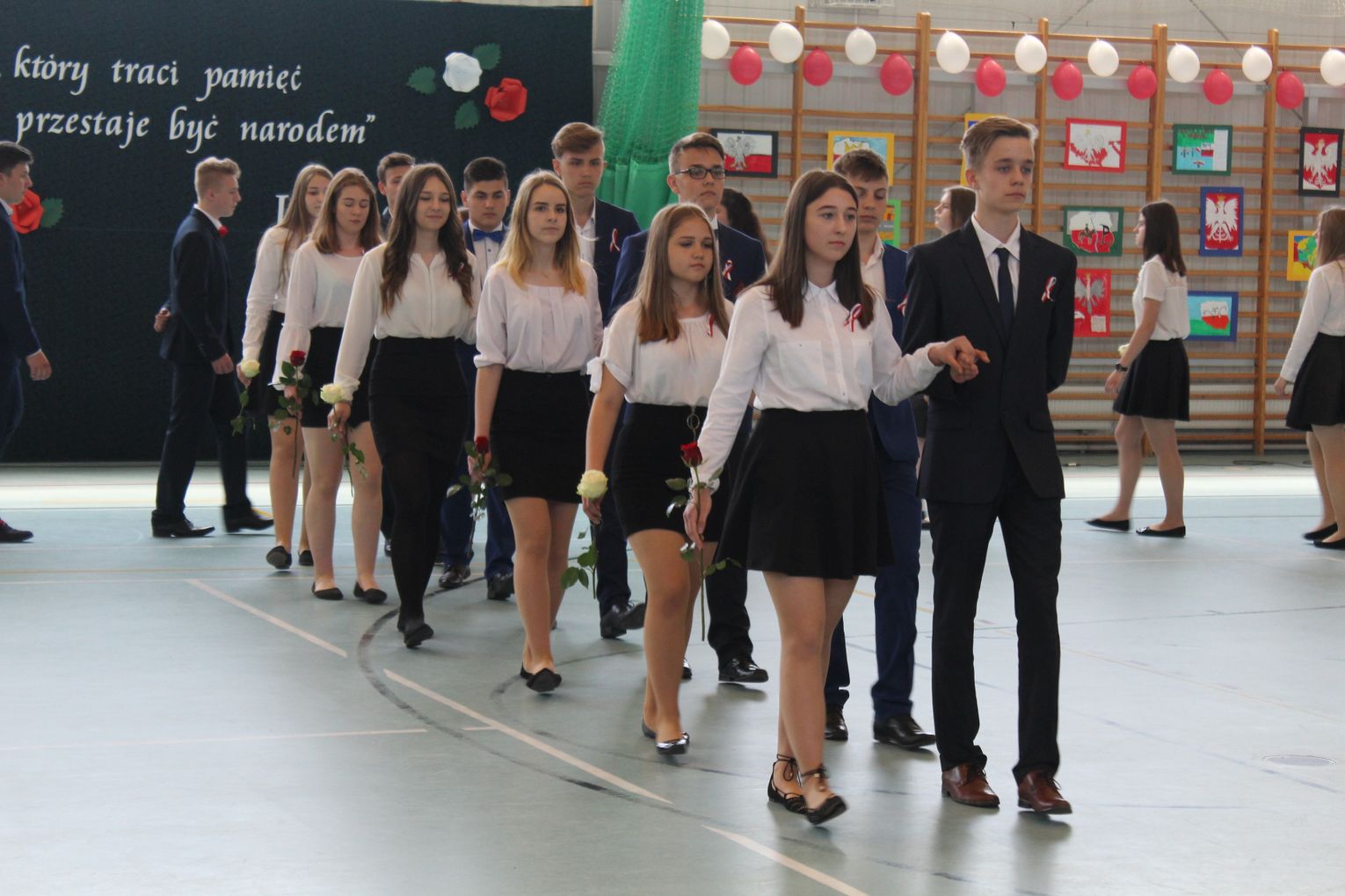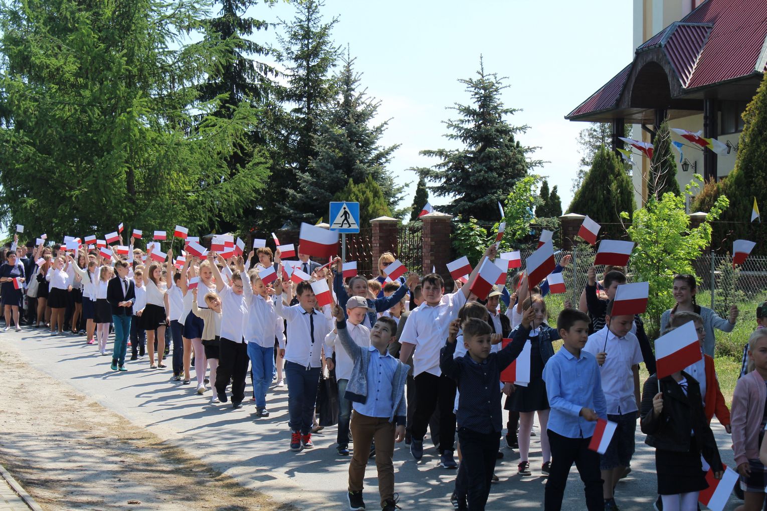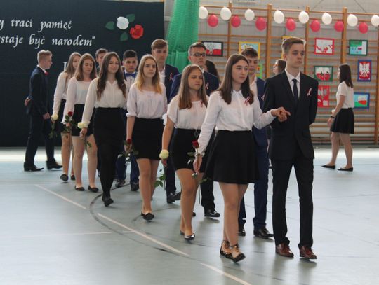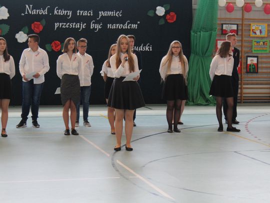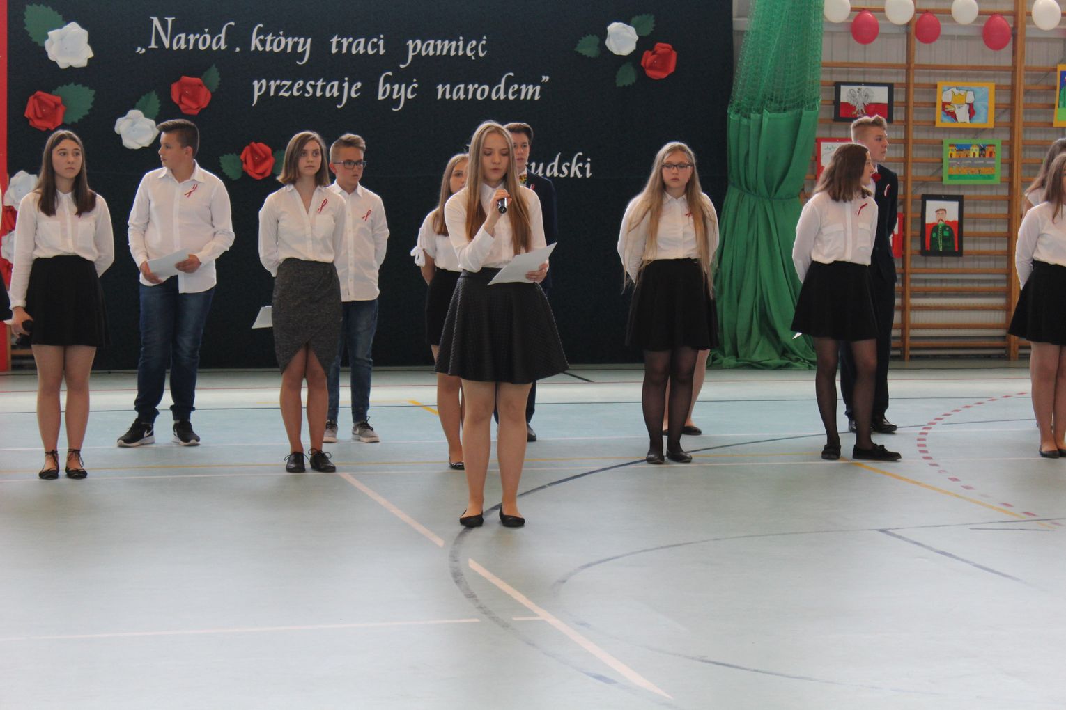 Po Mszy św. nastąpił przemarsz „biało-czerwonego” korowodu z kościoła pod pobliską szkołę. Większość uczestników korowodu miało biało-czerwone chorągiewki. Delegacja organizatorów i gości wydarzenia złożyła wiązanki kwiatów pod pamiątkową tablicą Józefa Piłsudskiego – patrona szkoły. Kolejnym punktem uroczystości było posadzenie dębu, symbolizującego pamięć o setnej rocznicy odzyskania niepodległości. Wielu znakomitych uczestników tego „ogrodniczego” aktu po kolei pracowało szpadlem. Potem wszyscy obejrzeli część artystyczną, przygotowaną w szkolnej hali sportowej. Dyrektor szkoły Anna Kowalczyk oficjalnie powitała wszystkich obecnych, po czym zabrzmiały tony poloneza, a na parkiecie pojawiły się tańczące pary gimnazjalistów. Potem były wiersze, monodramy, koncerty i pieśni. Uczniowie szkoły podstawowej i oddziałów gimnazjalnych przygotowali prawie godzinny występ, w którym przypomnieli historię Polski, postać Józefa Piłsudskiego oraz trudną drogę naszego kraju do niepodległości. Przedstawiony program wywołał autentyczny zachwyt przybyłych gości, a słowa podziękowania za jego przygotowanie otrzymali z ust Wójta wszyscy organizatorzy i wykonawcy. Nad przepiękną formą uczniowskich występów czuwały w szczególności nauczycielki Ewa Palonka, Anna Łasocha, Monika Łasocha, Halina Konarzewska, Anna Tomaszewska i Dorota Marczuk.