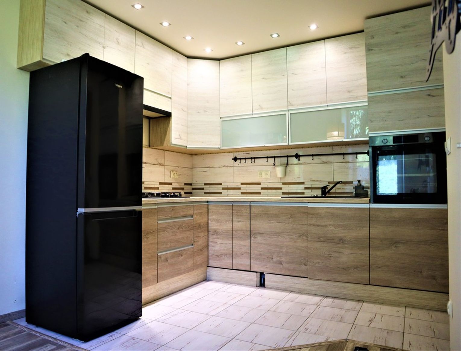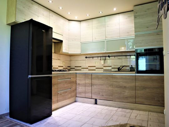 Kuchnia wyposażona w meble i sprzęt AGD (płyta gazowa, lodówka, piekarnik dual cook, zmywarka) w zabudowie.