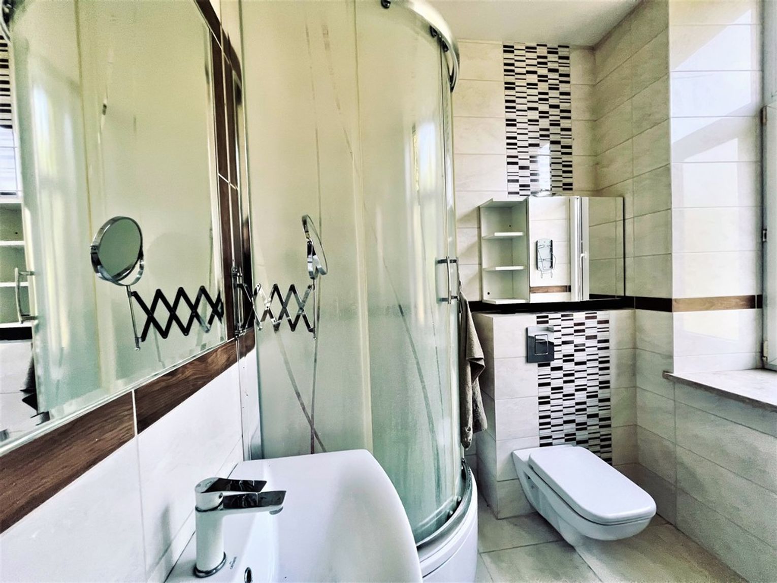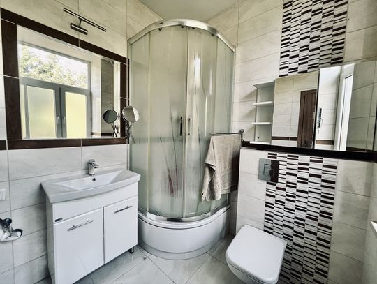 W łazienkach i kuchni na ścianach glazura, na podłogach terakota (ułożone w 2017). W przedpokoju na podłodze gres, w pozostałych pomieszczeniach panele.