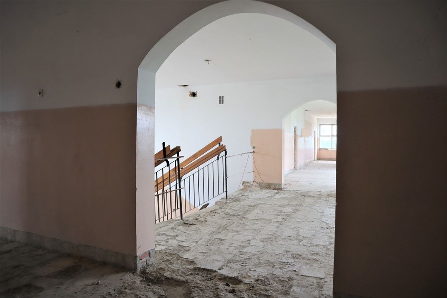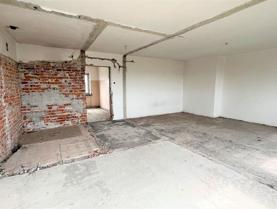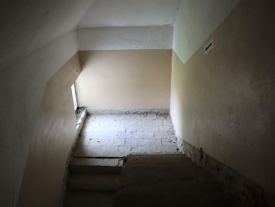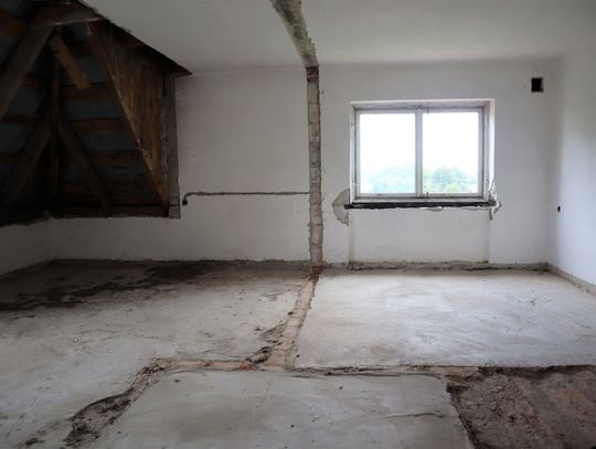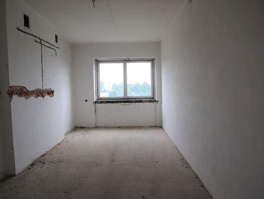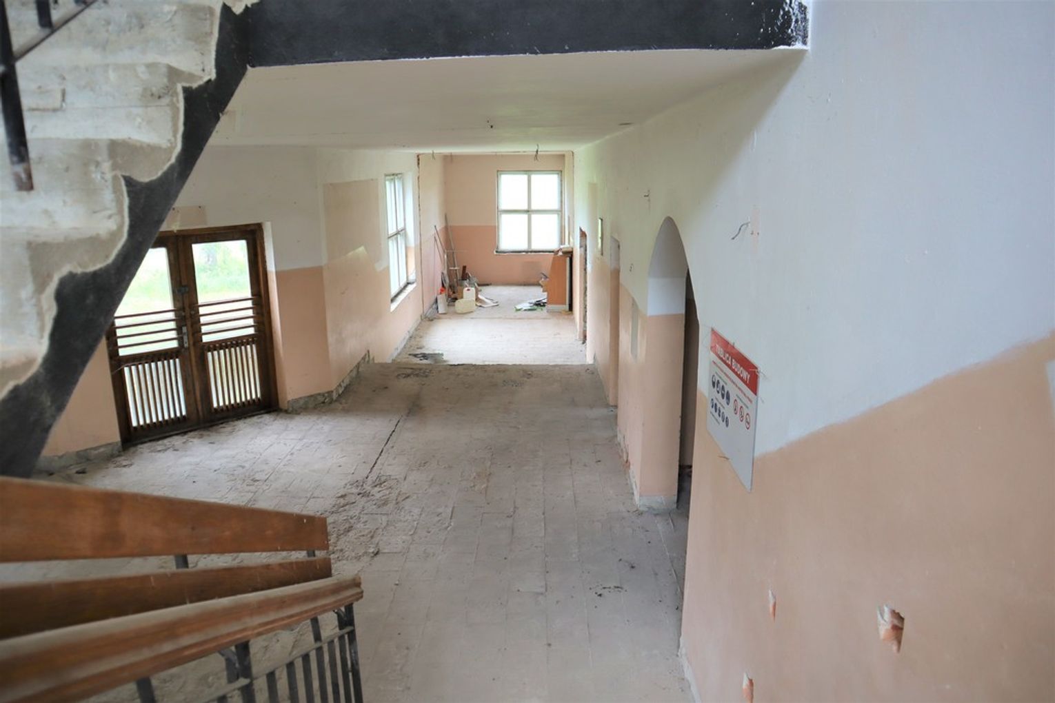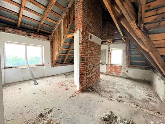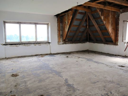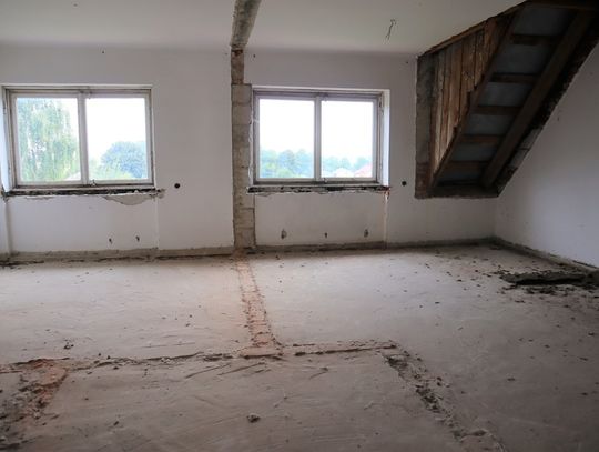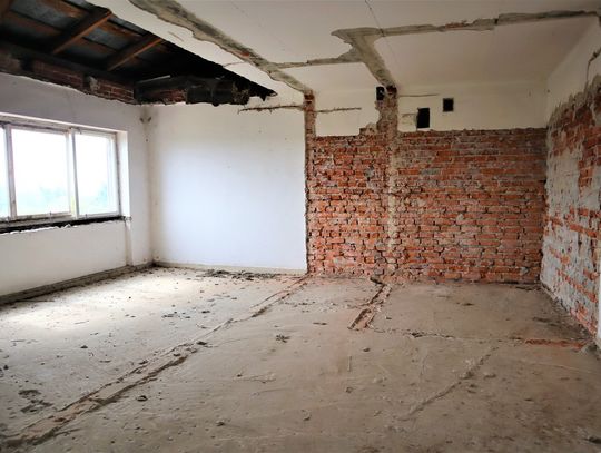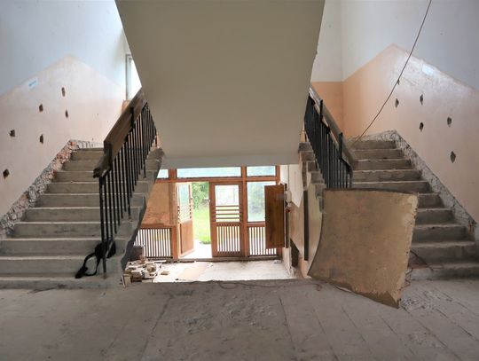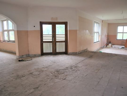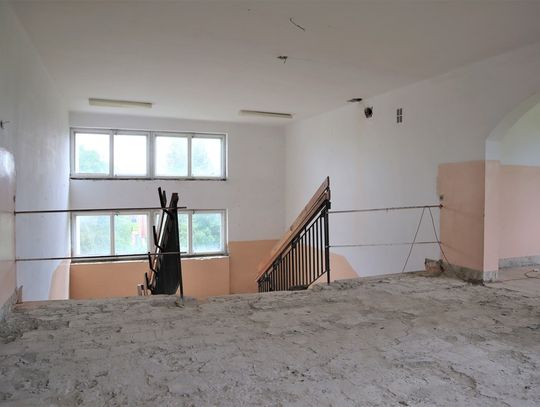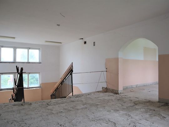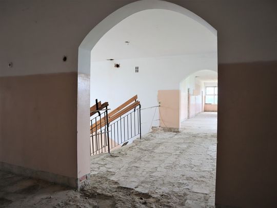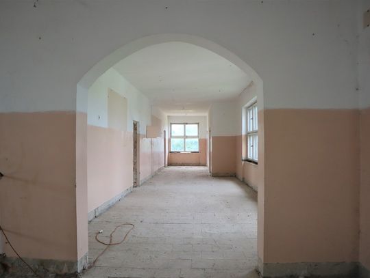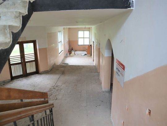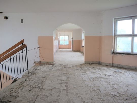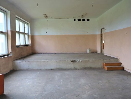 Obiekt byłej Szkoły Podstawowej, w której zostały przerwane prace adaptacyjne, przeprowadzane na potrzeby przebudowy budynku.