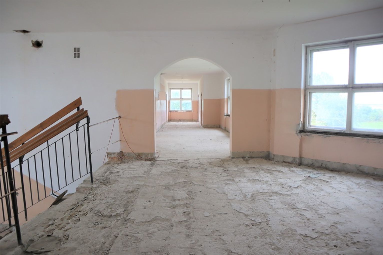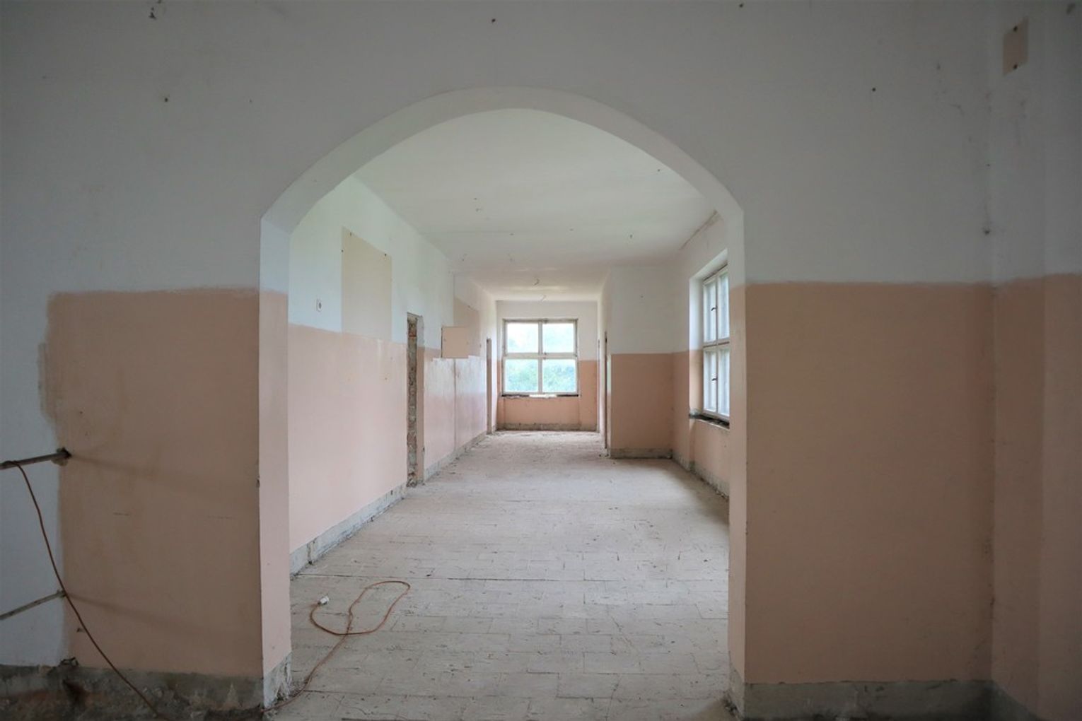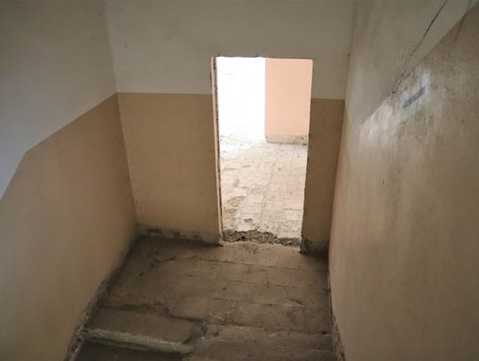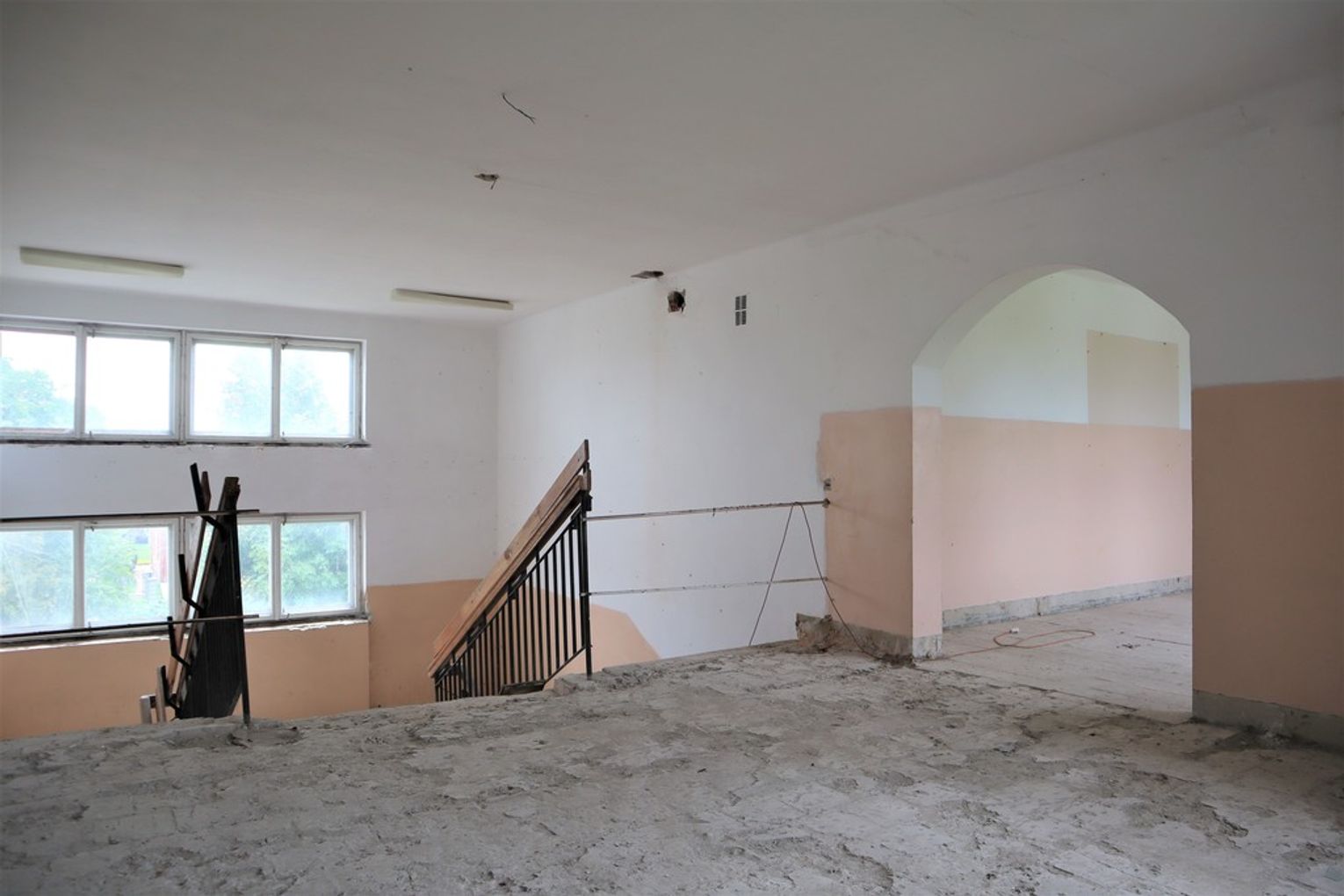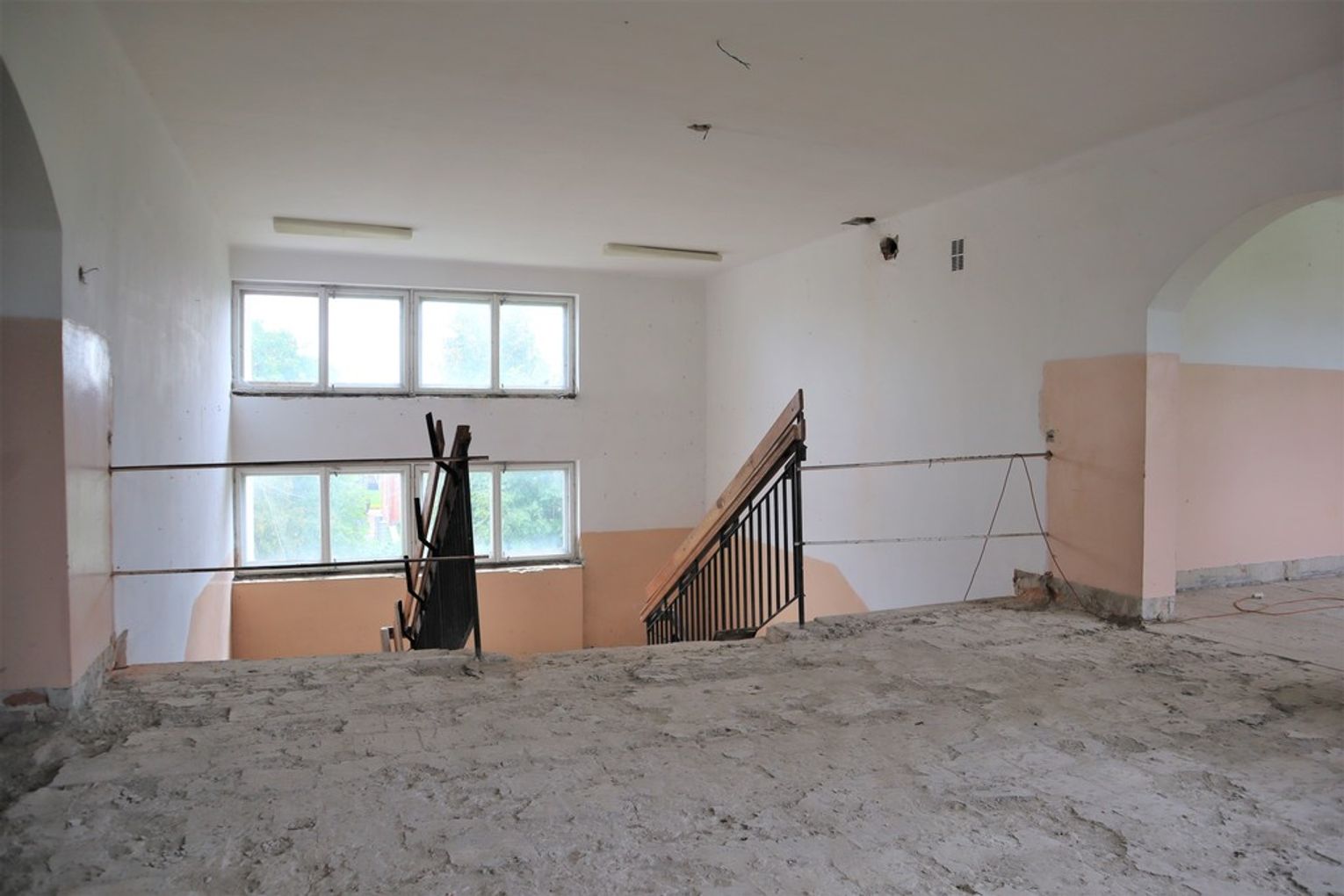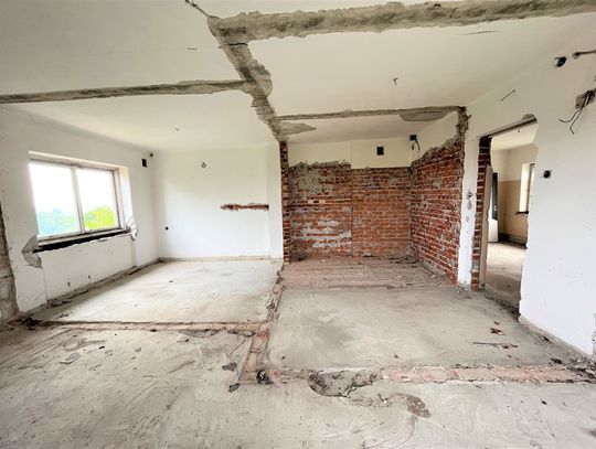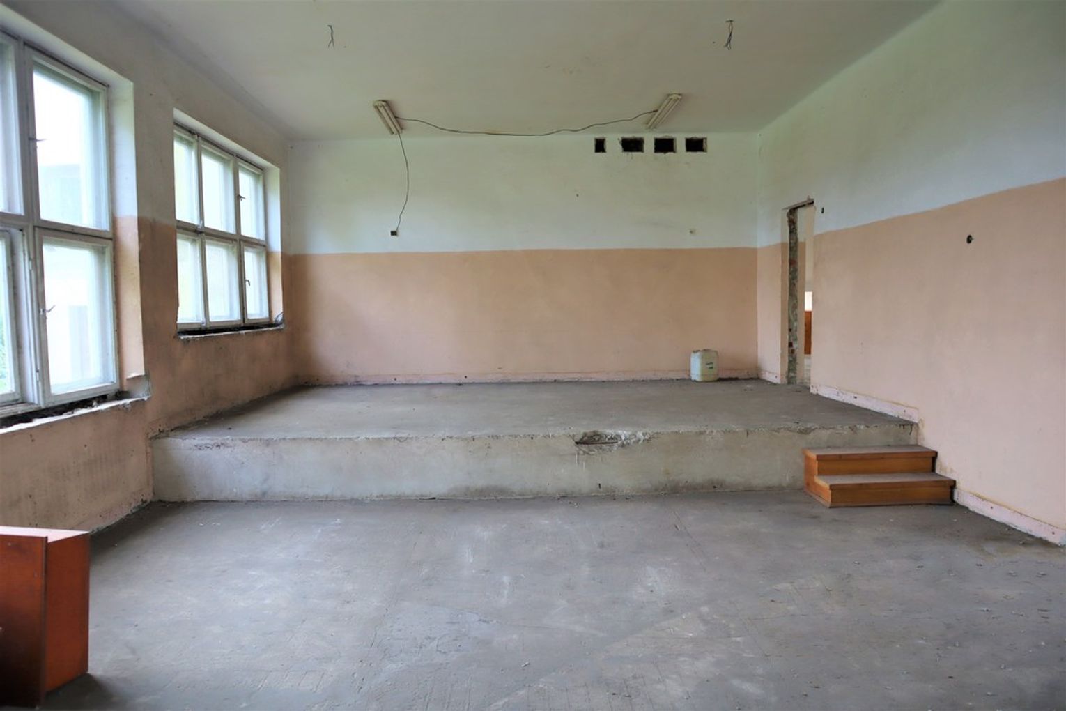 Obiekt byłej Szkoły Podstawowej, w której zostały przerwane prace adaptacyjne, przeprowadzane na potrzeby przebudowy budynku.