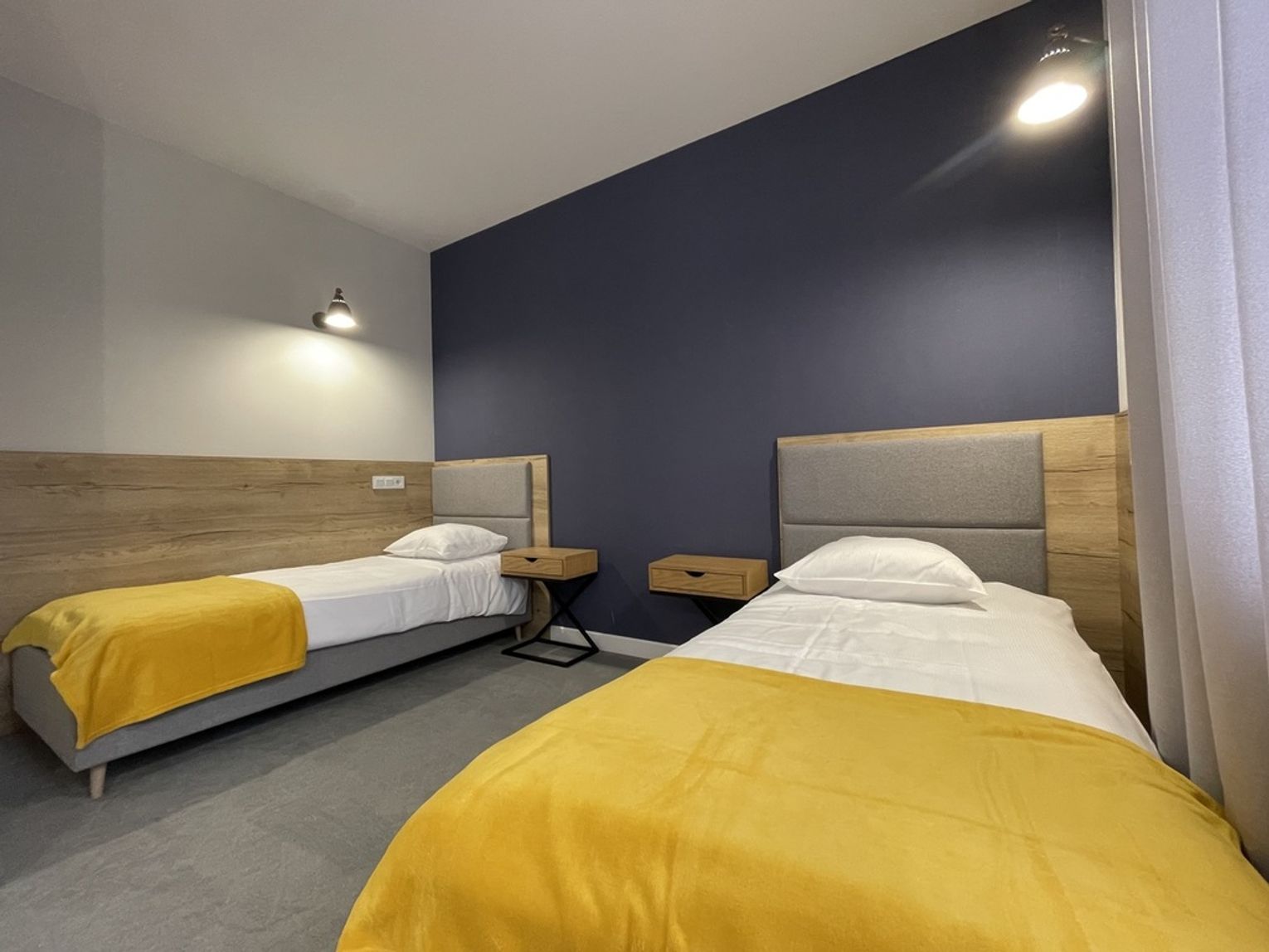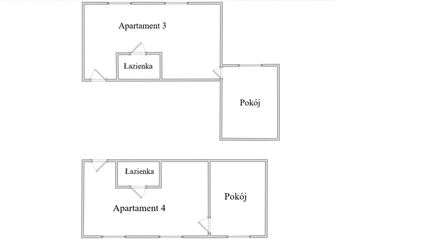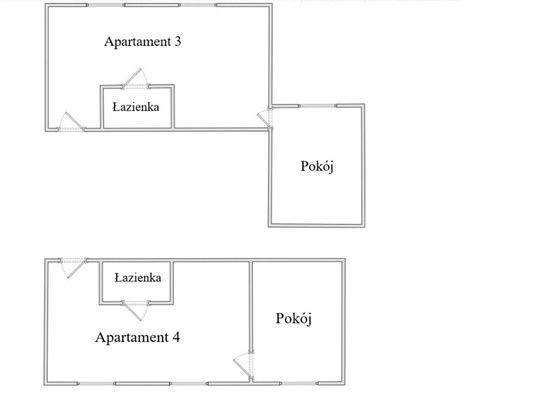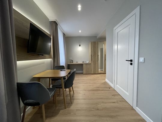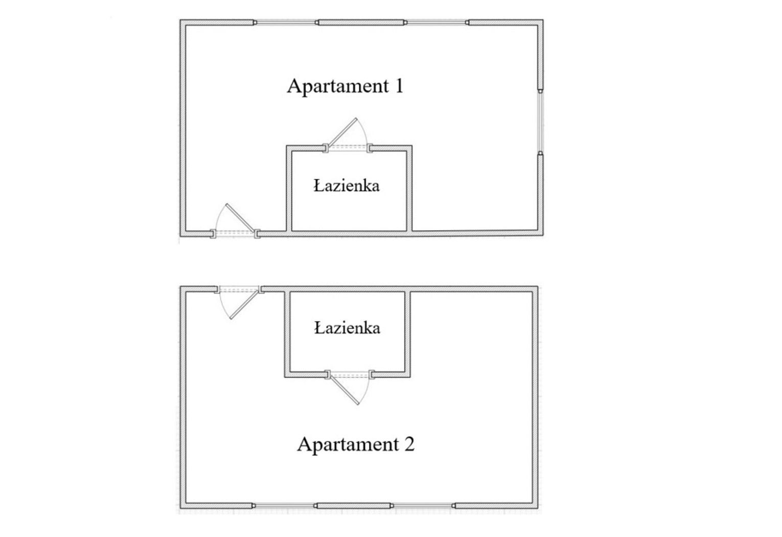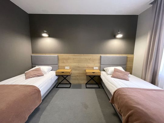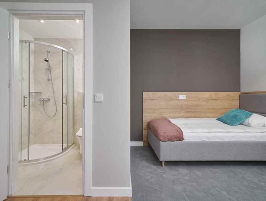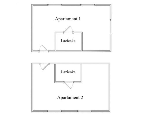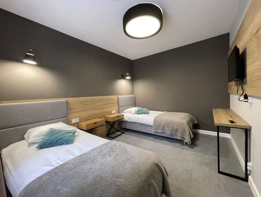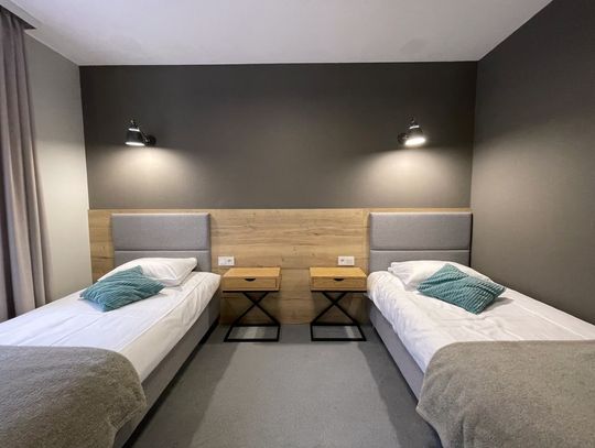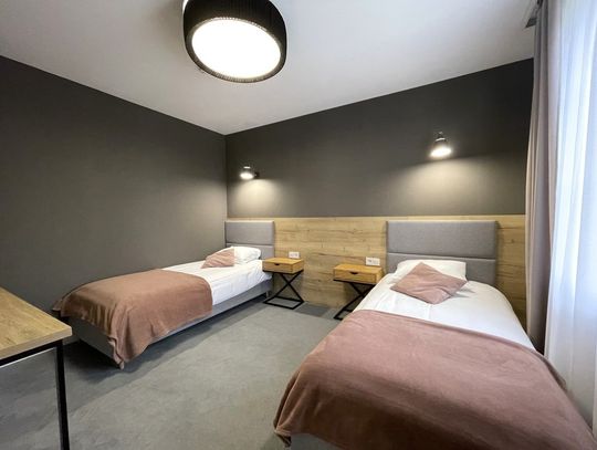 Wysoki parter: dwa mikroapartamenty dwuosobowe o powierzchni około 26,5 m2. Każdy z prywatną łazienką.