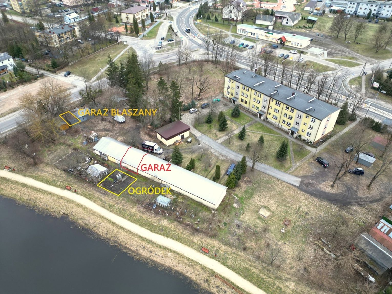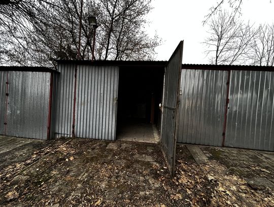 -blaszany garaż o powierzchni 25 m2. W tylnej części garażu znajduje się wydzielone miejsce na warsztat, wyposażone w regały i stół do pracy, z osobnym wyjściem. Garaż podłączony do trzyfazowej instalacji prądu elektrycznego.