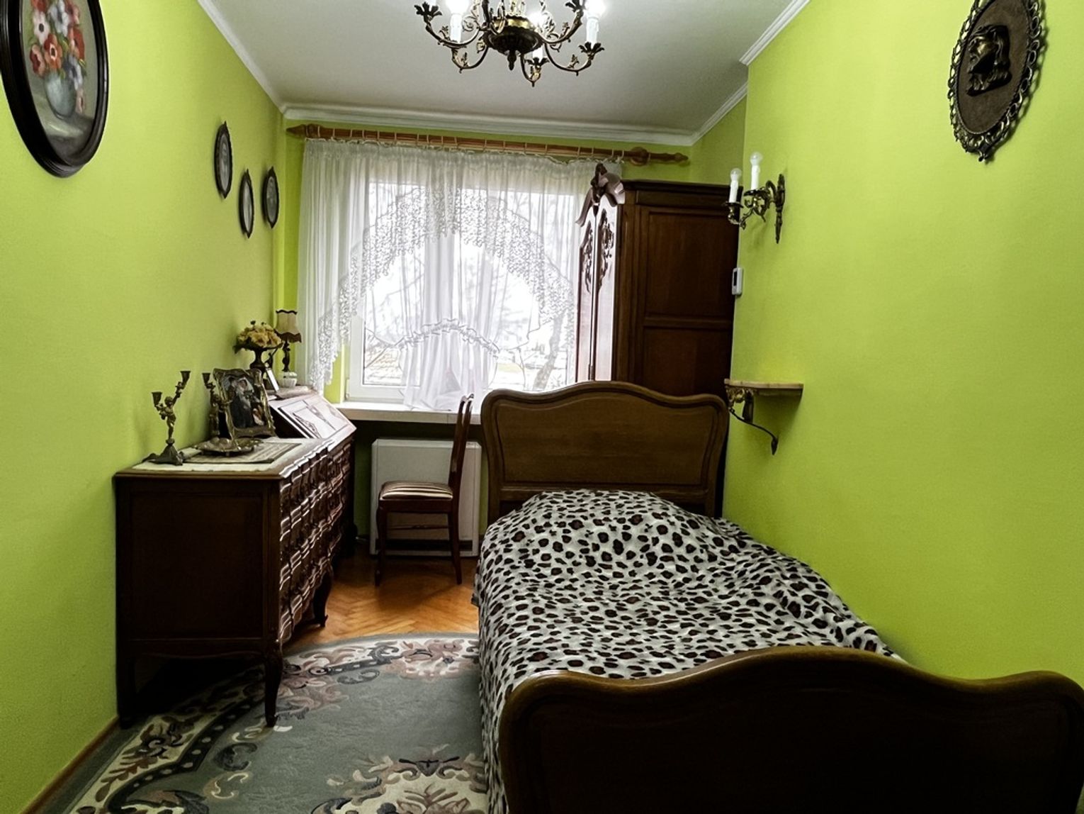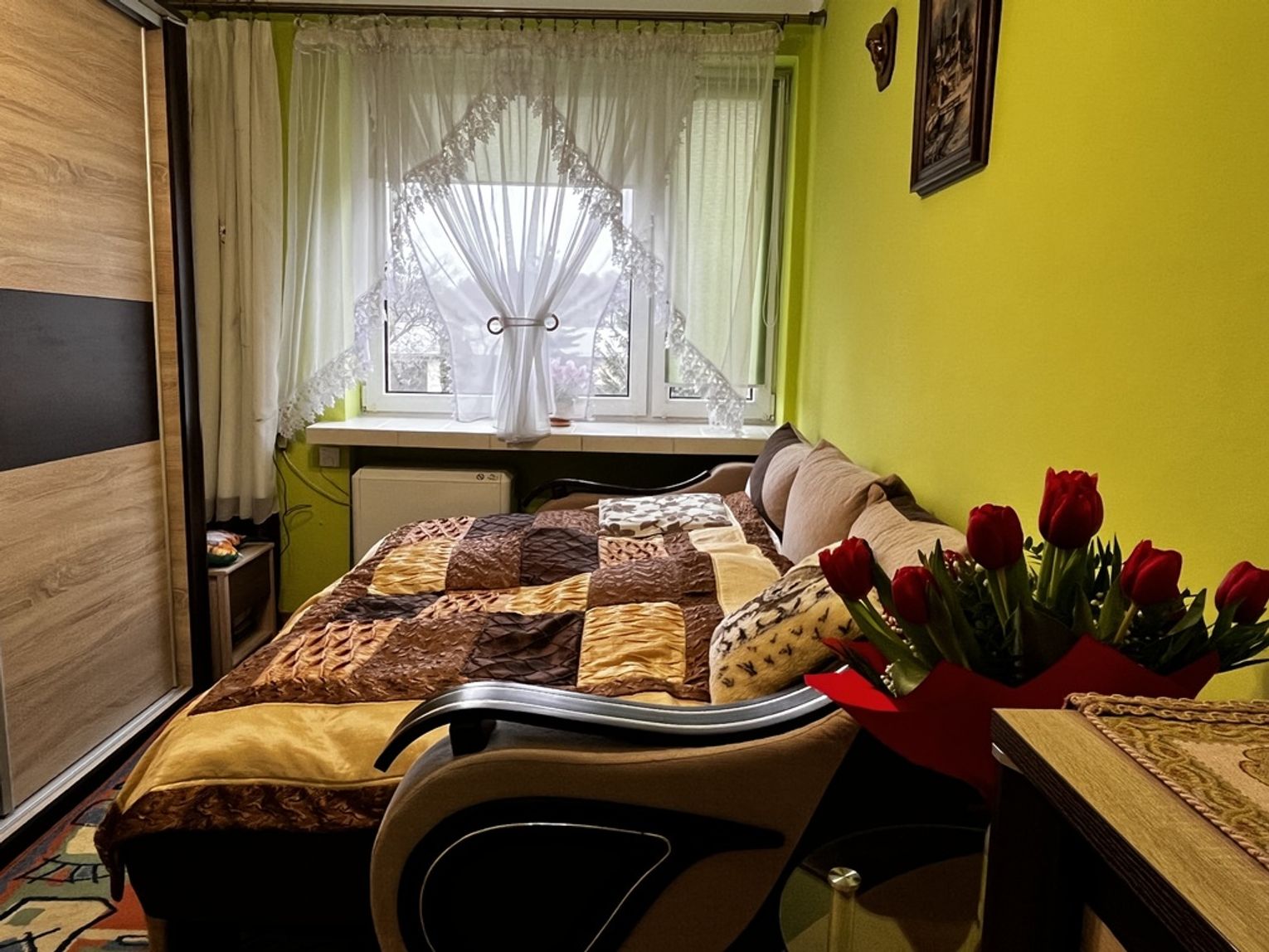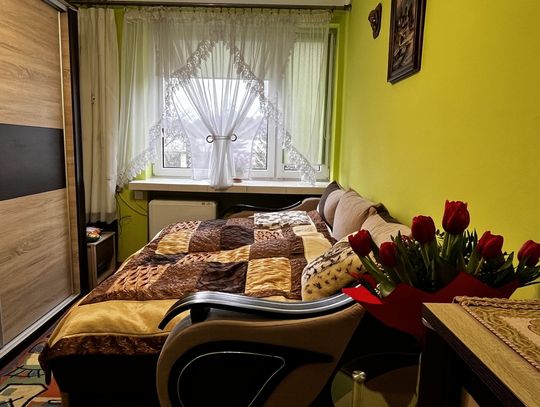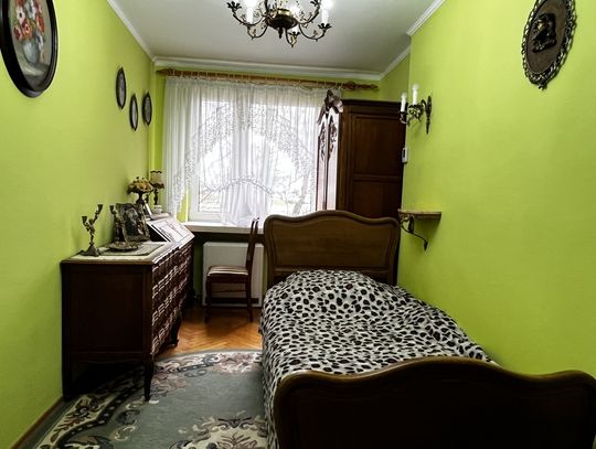 Sypialnia 2 -Wyposażona w szafę - w środku przestrzeń z wieszakami i półkami oraz rozkładaną kanapę. Okna w kierunku północnym, z widokiem na drzewa i podwórze.