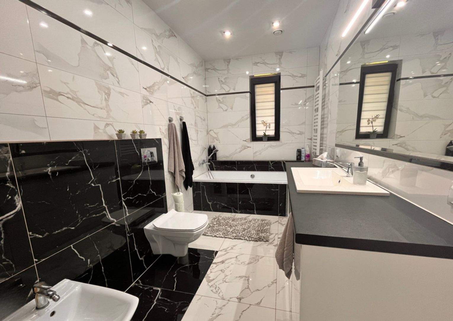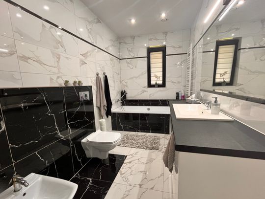• Rodzinnej łazienki z wanną. Obie dostępne w domu toalety wykończono w nowoczesnym stylu z wykorzystaniem sprzętów i materiałów wysokiej jakości.