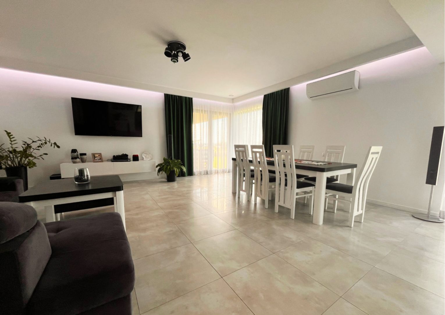 • Klimatyzowany salon z częścią wypoczynkową – kanapą i telewizorem. Bezpośrednio z salonu możliwe jest przejście do kuchni oraz na taras. Pomieszczenie jest bardzo jasne, przestronne.