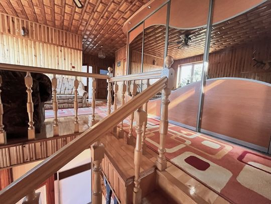 - Piękne drewniane schody. Wygodne, ze spocznikiem, wyposażone w praktyczną i stylową, intarsjowaną balustradę.