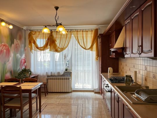 Kuchnię (15 m2) wyposażoną w drewniane meble w zabudowie oraz podstawowe sprzęty AGD. Z kuchni dostępne bezpośrednie wyjście na taras przez drzwi balkonowe.