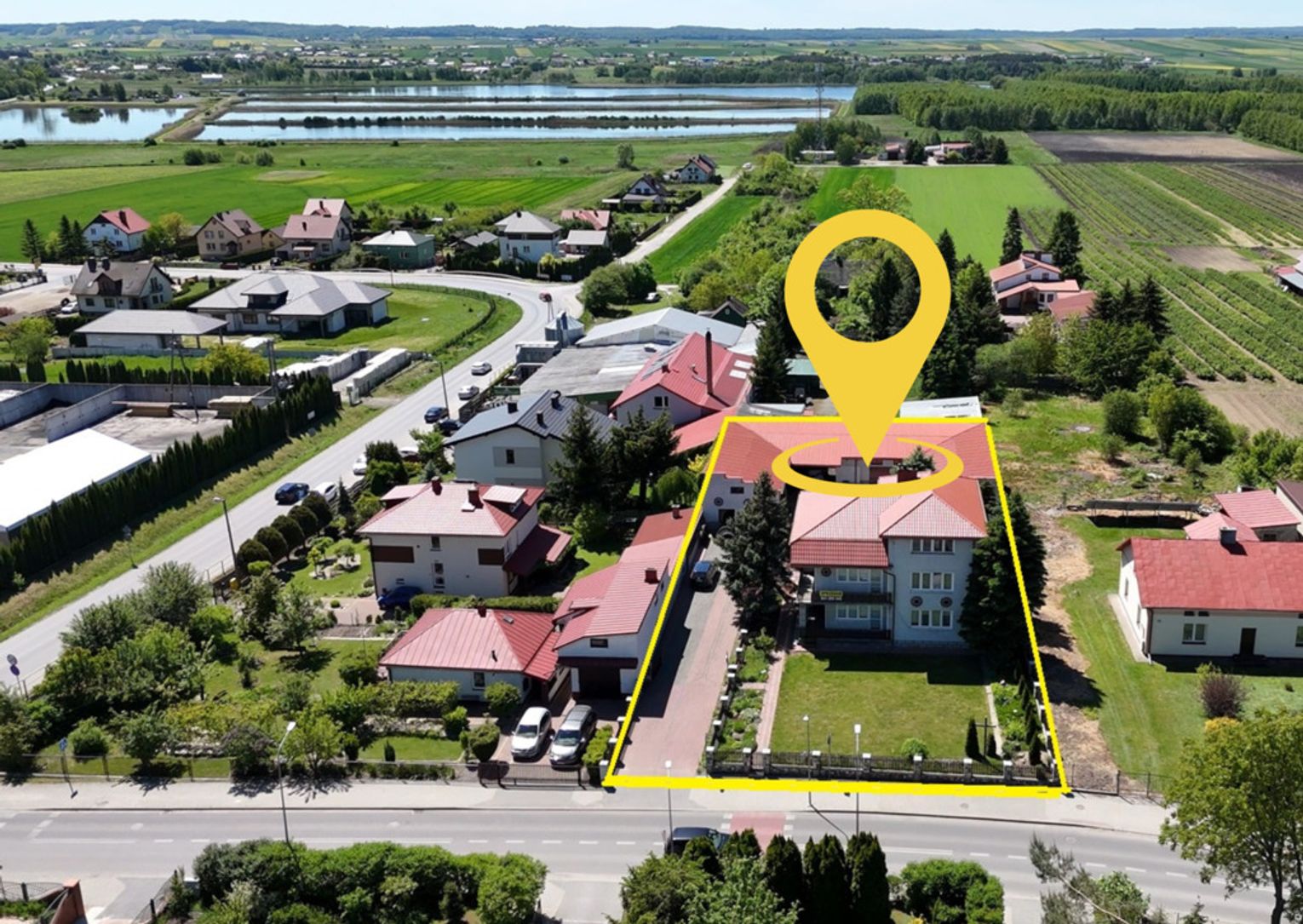 Nieruchomość zlokalizowana jest w centralnym punkcie Kalinowic, bezpośrednio przy trasie wyjazdowej z miasta.