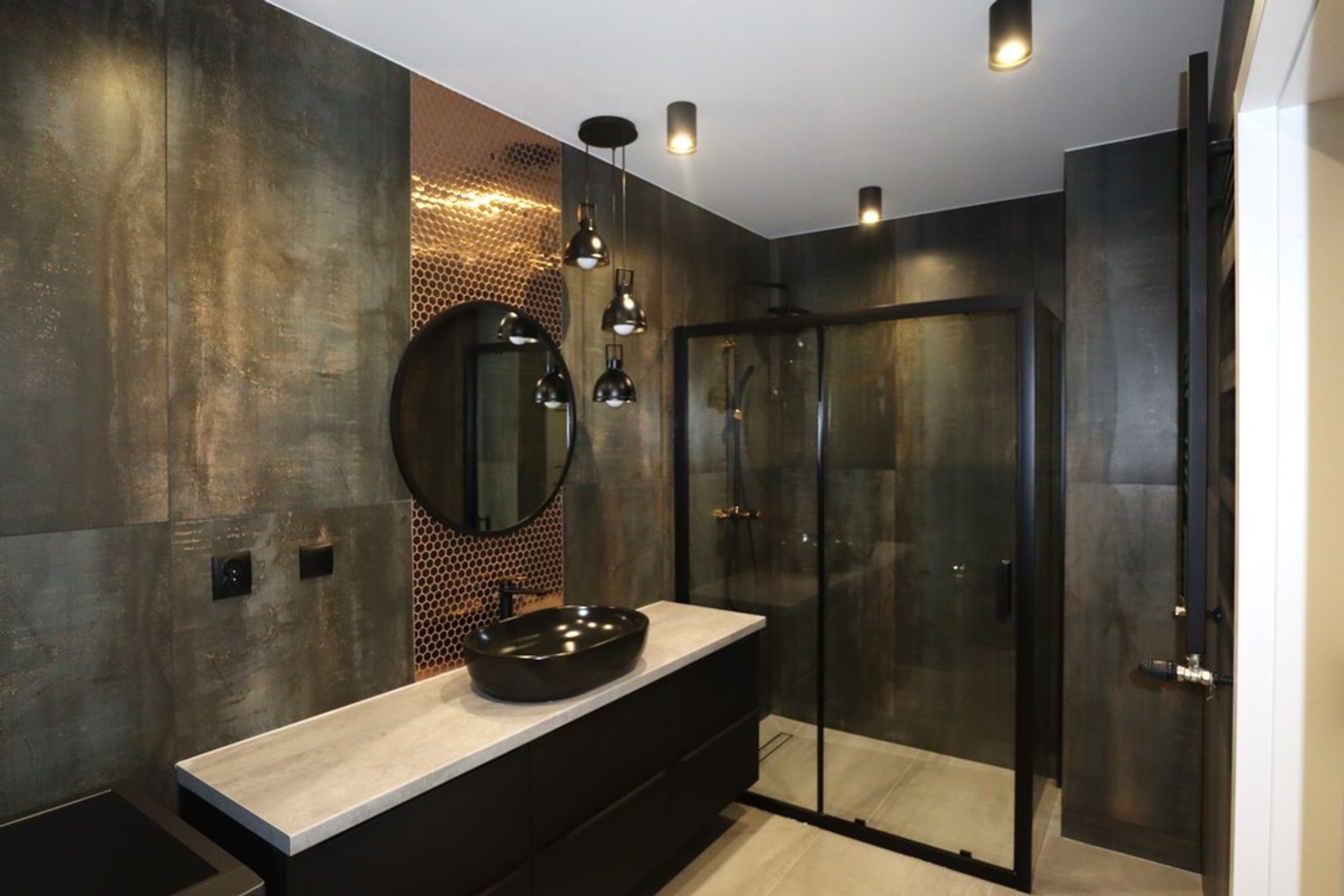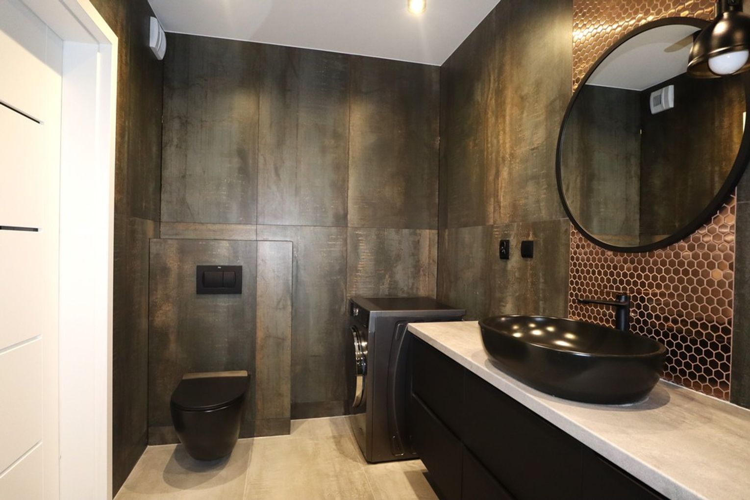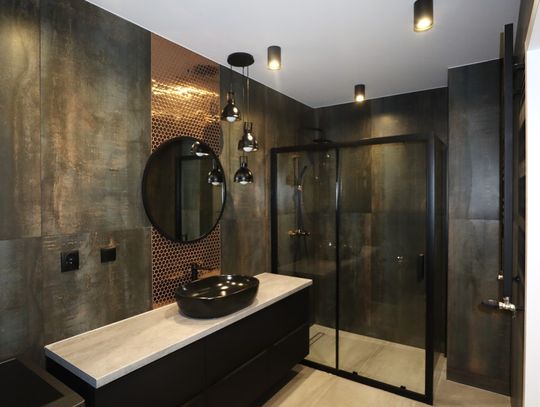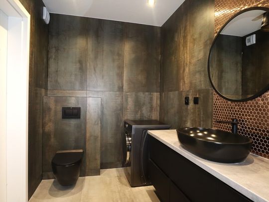 Łazienka, która została wykończona w wysokim standardzie, z nowoczesnymi sanitariatami, prysznicem oraz miejscem na pralkę.