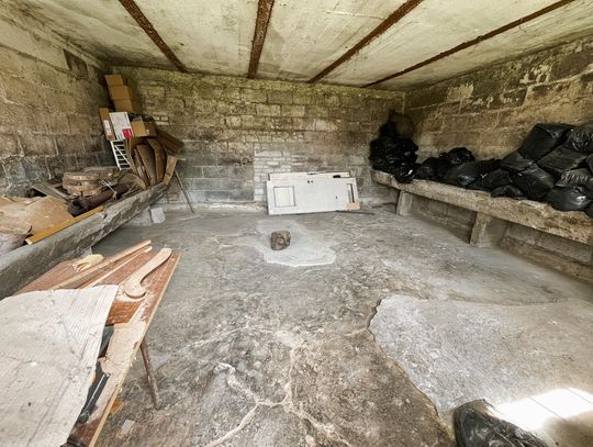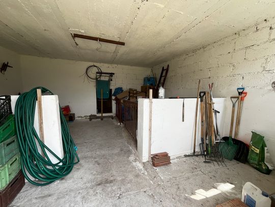 - Budynek gospodarczy murowany, gdzie znajdziemy garaż i dwa duże pomieszczenia do dowolnej adaptacji. Wnętrza są czyste, podłogi wykonano z wylewki betonowej. W budynku jest woda i prąd, również o większej mocy tzw siła.