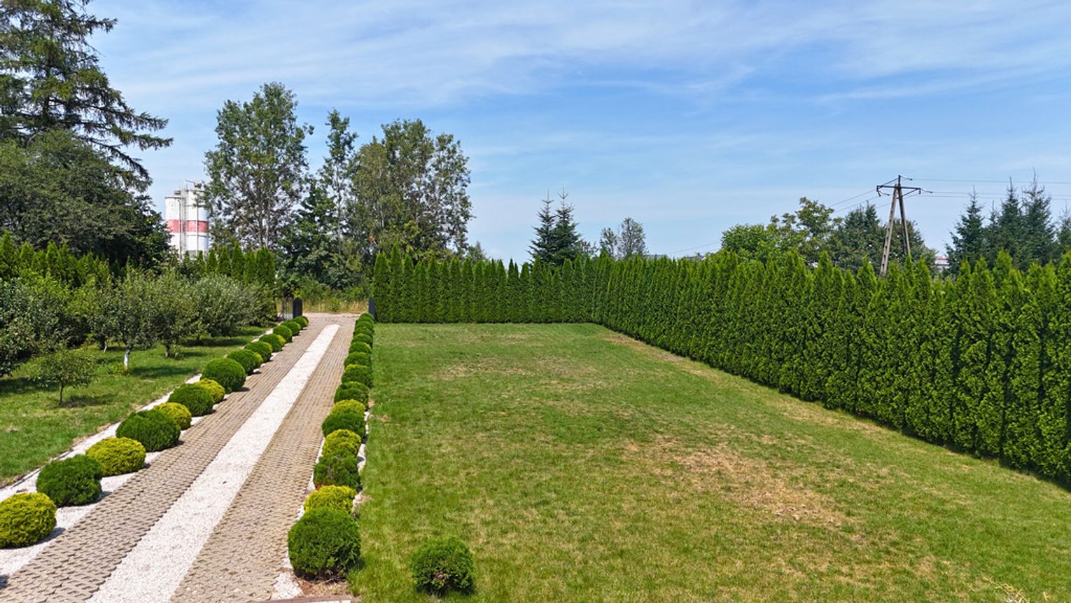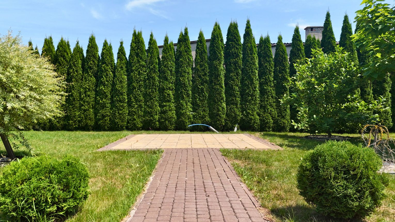 - Ogrodzenie: Płot z siatki stalowej z metalowymi słupkami i krzewami tuj