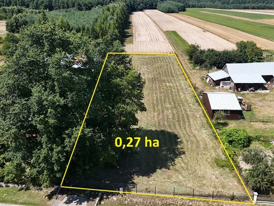 Wygląd: Prostokąt, działka płaska, od południa granicząca z drogą lokalną, działka ogrodzona z bramą wjazdową.
