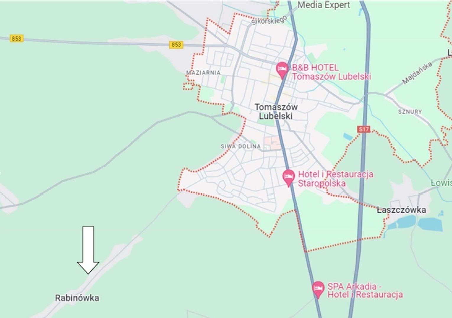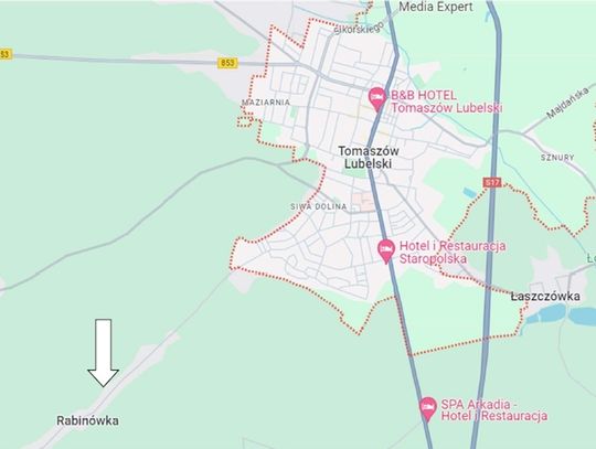 Lokalizacja: Bliskie przedmieścia Tomaszowa Lubelskiego. Osiedlowa część miejscowości Rabinówka, bezpośredni zjazd z działki na drogę gminną. Natężenie ruchu niskie, ruch lokalny.