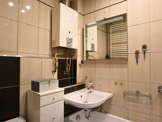 Łazienka: funkcjonalna, wyposażona w piecyk gazowy do podgrzewania wody