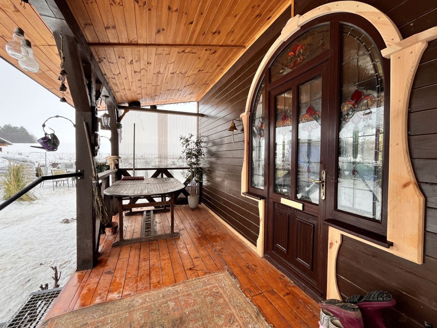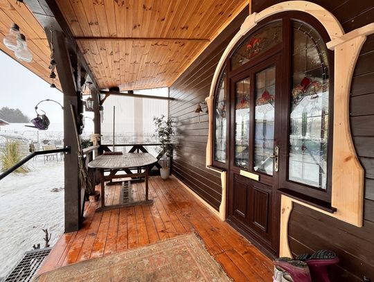 Na zewnątrz znajduje się zadaszona weranda, sprzyjająca wypoczynkowi na świeżym powietrzu.