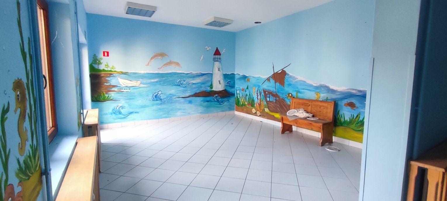 - Aktualnie zaadaptowany na przedszkole – 4 przestronne sale, WC dla dzieci i dorosłych, pomieszczenia pomocnicze