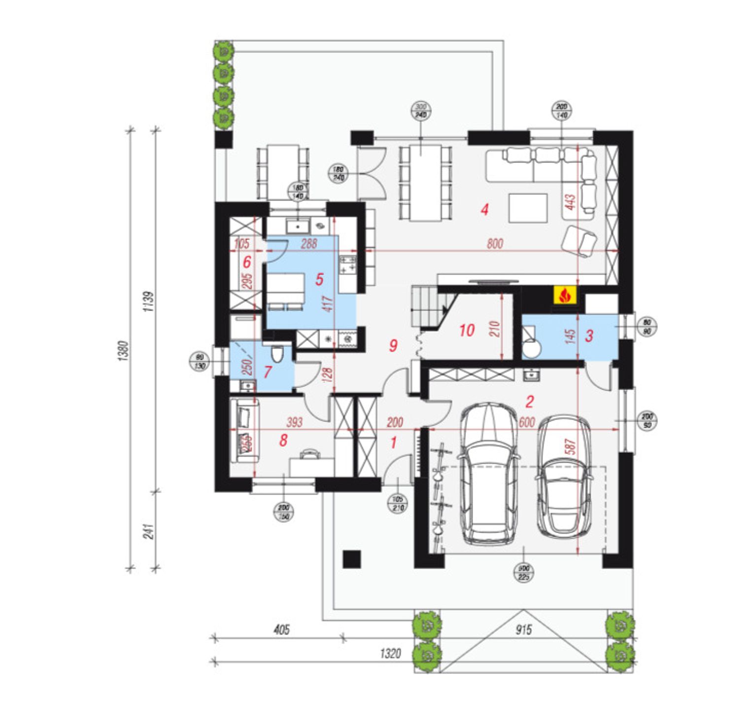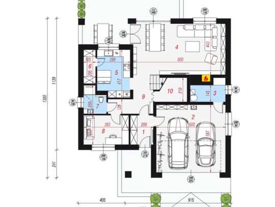 - wiatrołap z przejściem do kotłowni i garażu na dwa auta.