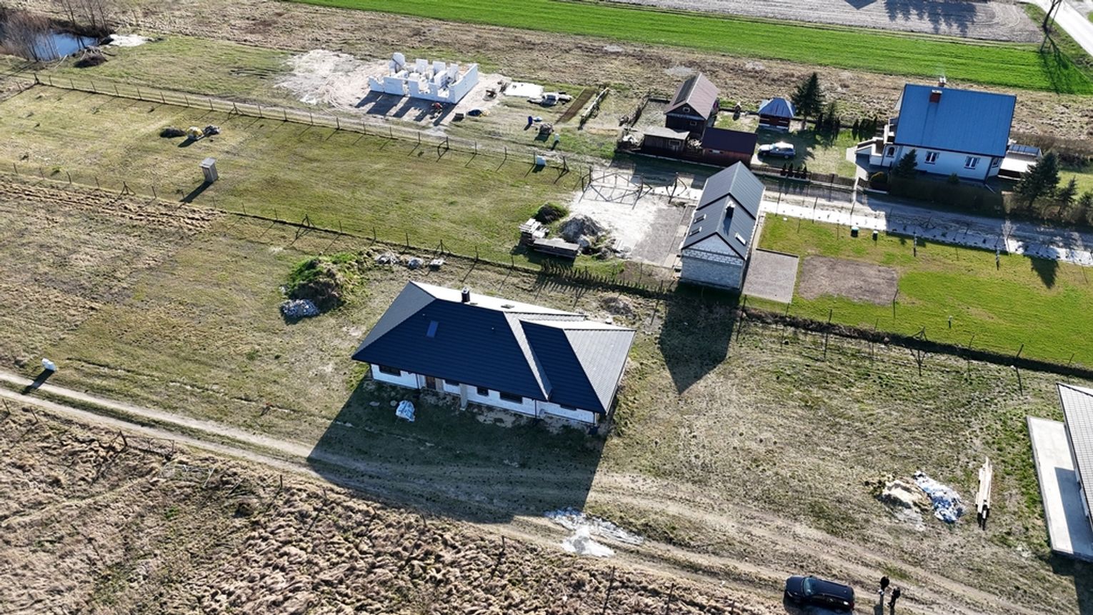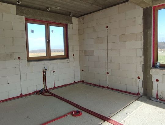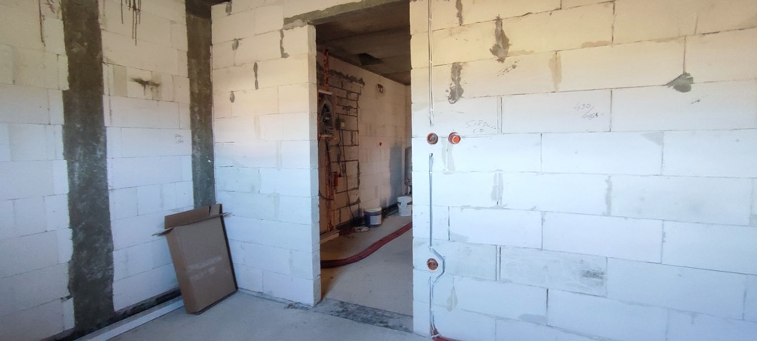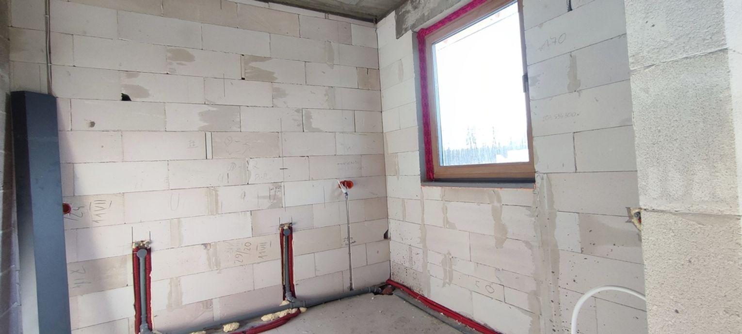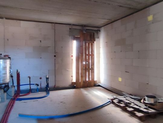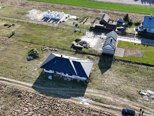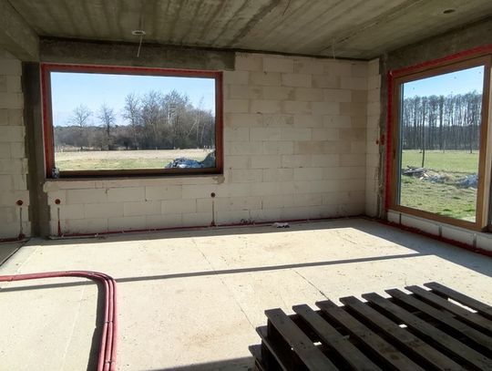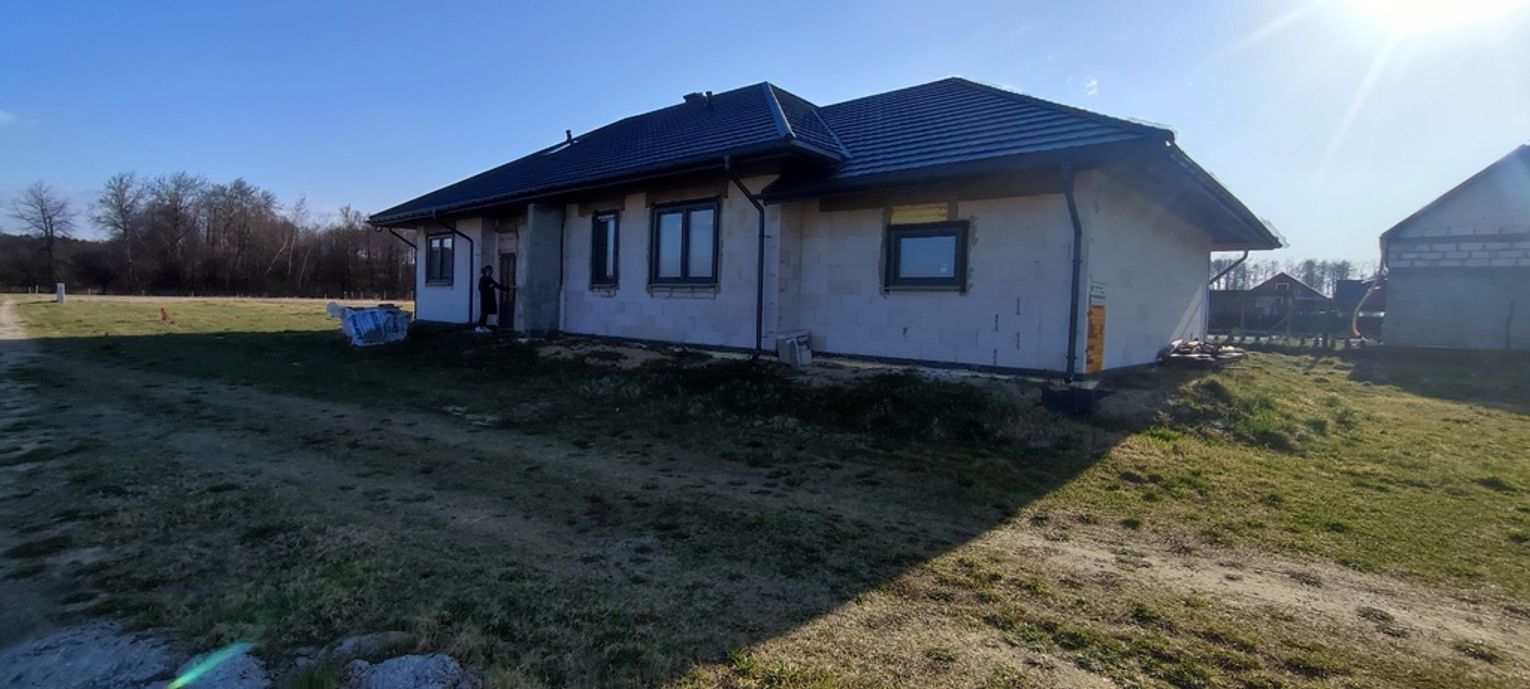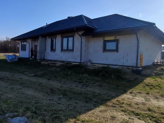 - Stan surowy zamknięty: wykonane ściany, dach (blachodachówka), okna PCV 3 szybowe,
