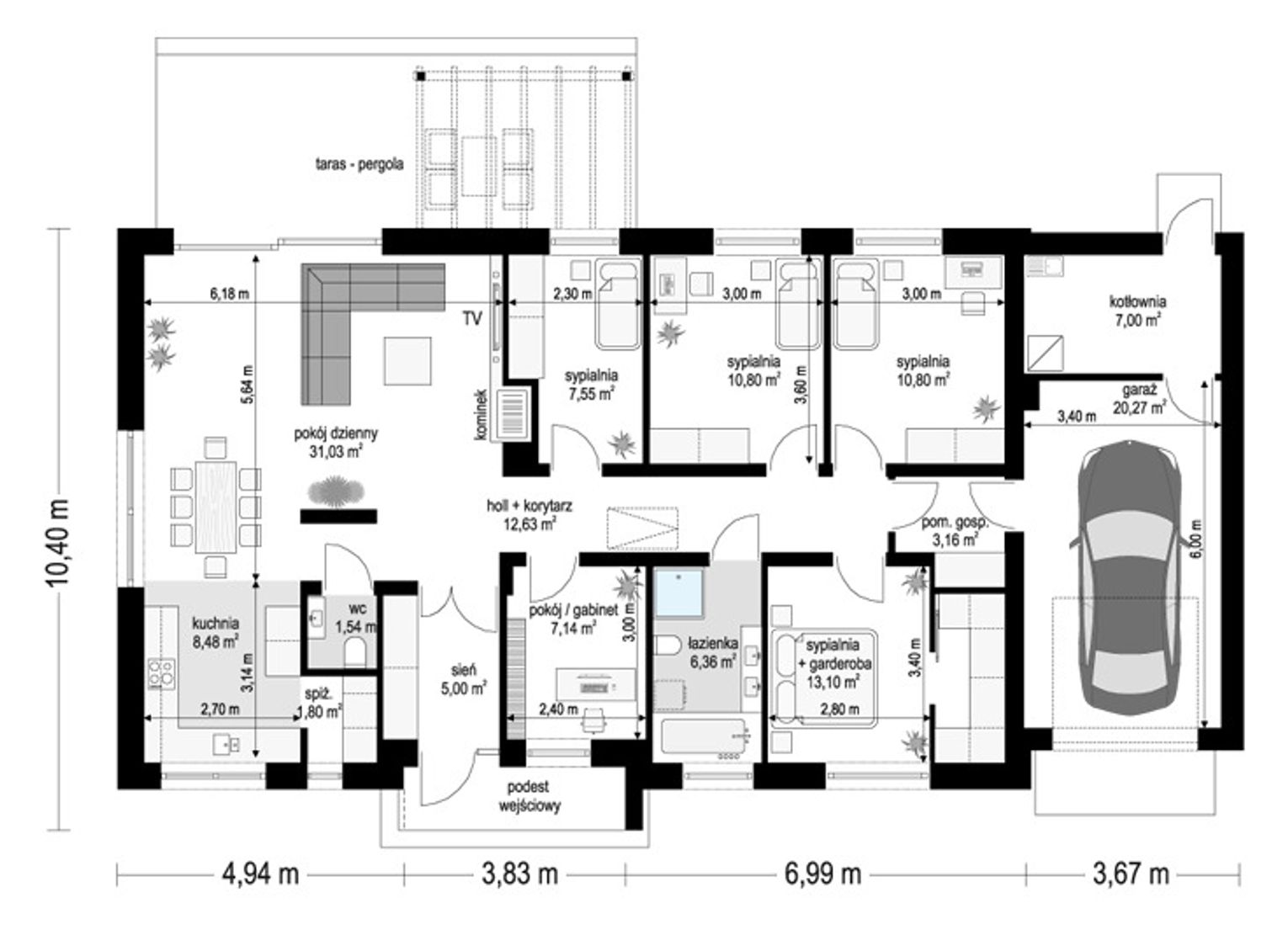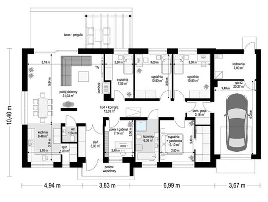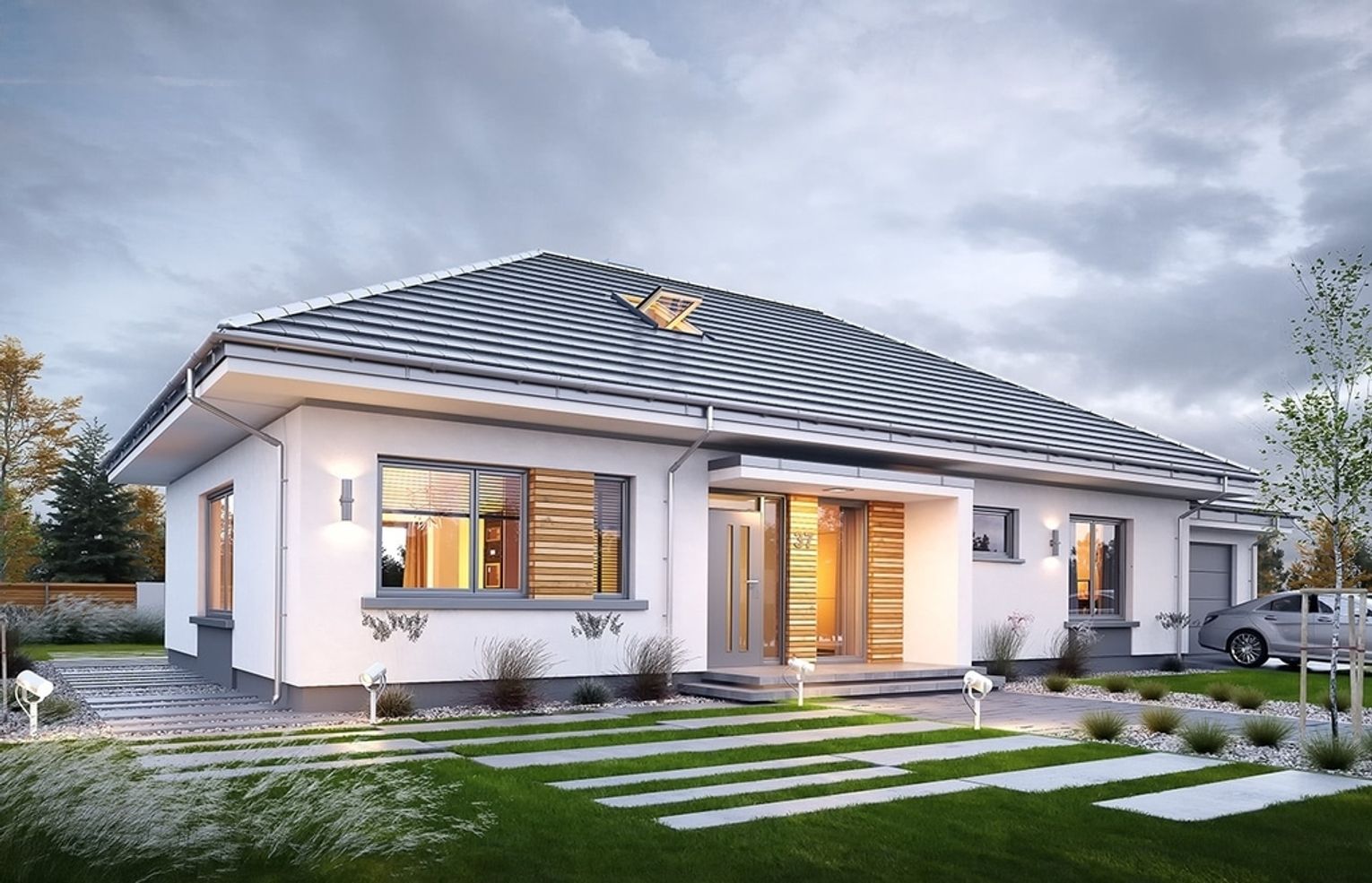 - Projekt zakłada: 5 pokoi, kuchnię otwartą na salon, 2 łazienki, garaż jednostanowiskowy