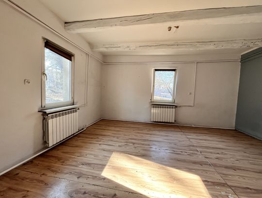 Nieruchomość obejmuje dużą, ogrodzoną działkę o powierzchni aż 2010 m², na której znajduje się murowany, wolnostojący budynek mieszkalny o pow. 42 m². Budynek wymaga remontu, ale jego solidna konstrukcja oraz ocieplenie czynią go doskonałą bazą do rozbudowy, adaptacji czy stworzenia zaplecza do prac inwestycyjnych na działce.