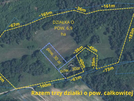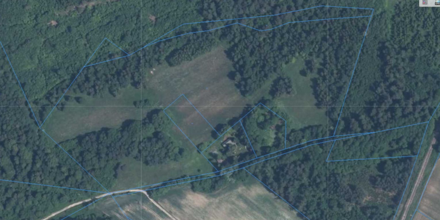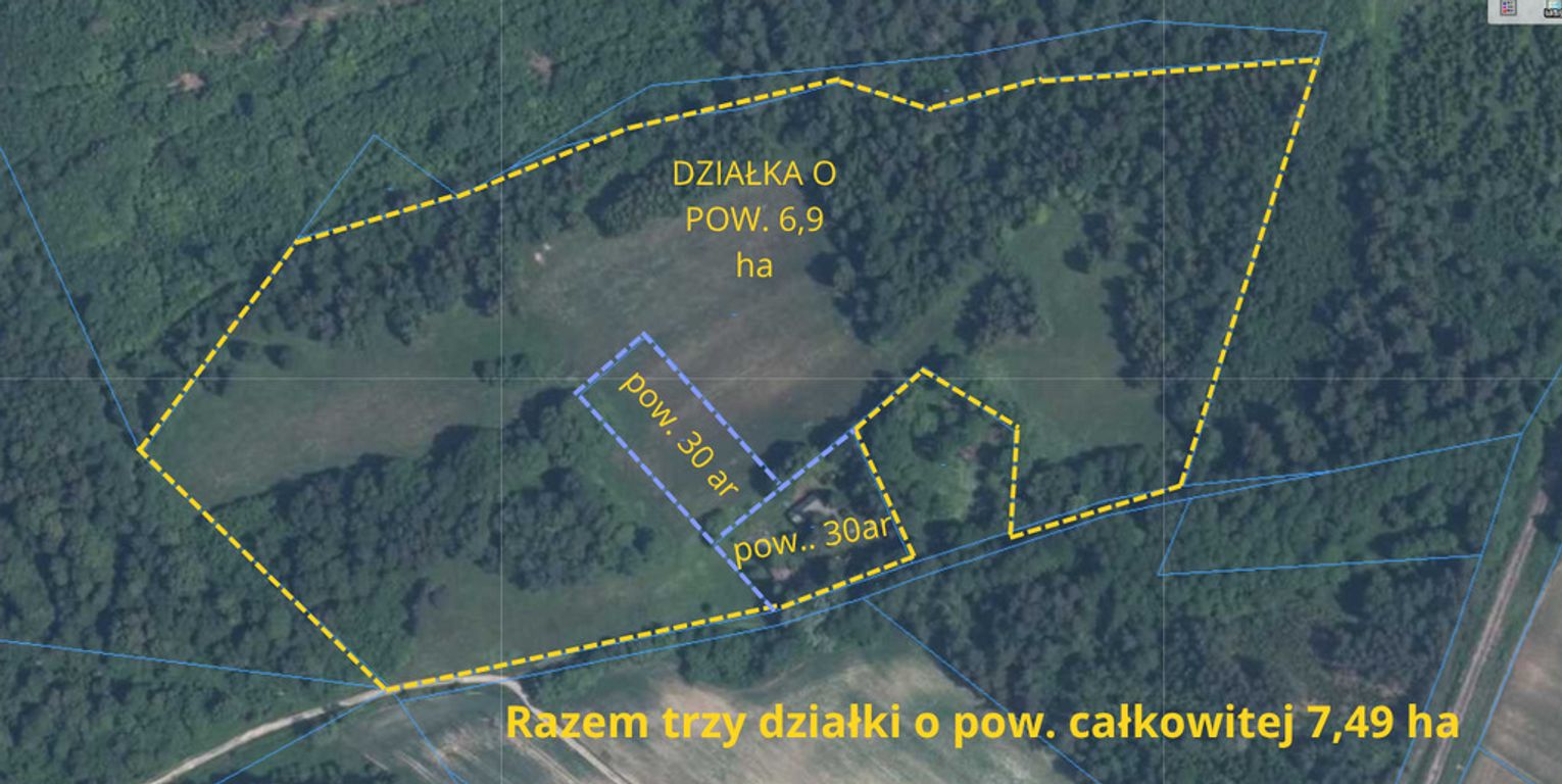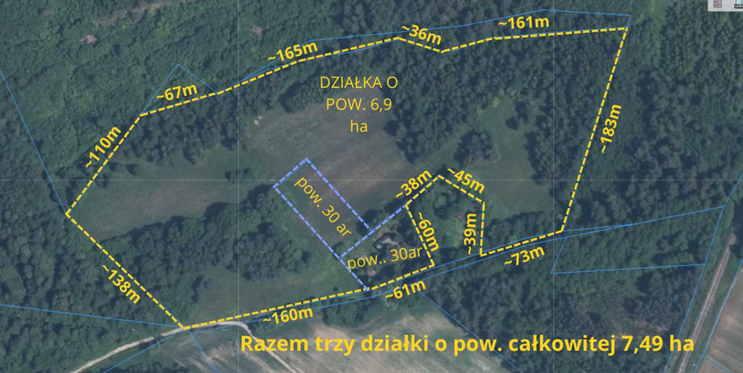 Posiadłość obejmuje trzy działki o powierzchni 7,49 ha, na jednej z nich znajduje się całoroczny dom i stodoła, obok łąki i lasy. Możliwość przystosowania do uprawy ziemi lun na stadninę.
