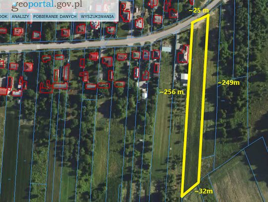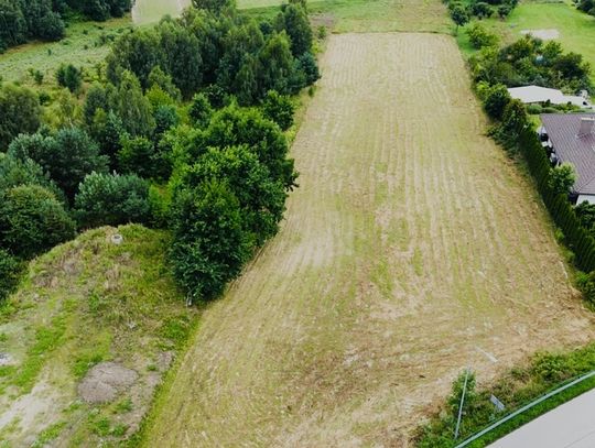Działka ma regularny kształt i korzystne położenie – dojazd odbywa się bezpośrednio z asfaltowej drogi gminnej, co gwarantuje łatwy dostęp przez cały rok. W najbliższej okolicy zabudowa jednorodzinna oraz tereny zielone – spokojna okolica, idealna pod budowę domu jednorodzinnego.