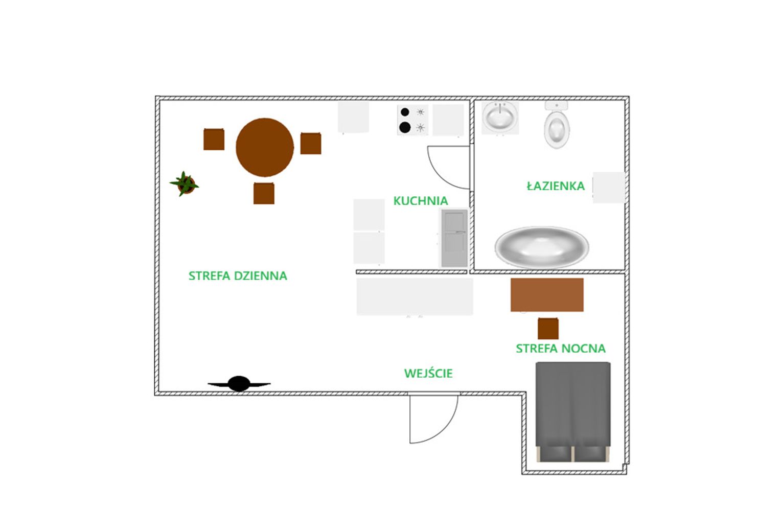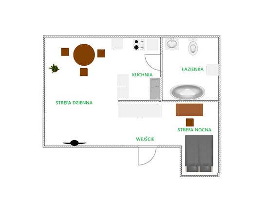 Na 29 m² powierzchni użytkowej (a realnie znacznie więcej dzięki dużym skosom – ok. +40%) zaaranżowano wygodną przestrzeń: