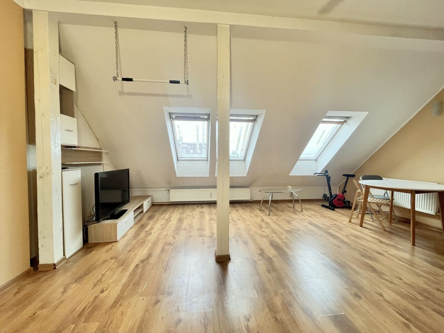- Część dzienna - telewizor, stół z krzesłami, stolik kawowy, zabudowa meblowa RTV.